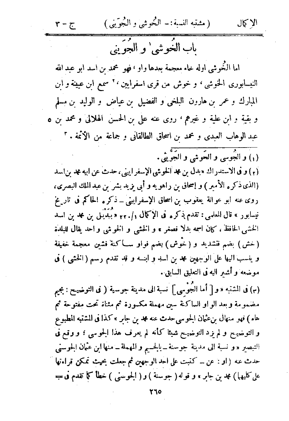 3 في المشتبه "و"أما الجُوْسي" نسبة إلى مدينة جوسية "في التوضيح: بجيم مضمومة وبعد الواو الساكنة سين مهملة مكسورة ثم مثناة تحت مفتوحة ثم هاء" فهو منهال بن عثمان الجوسي حدث عنه محمد بن جابر" كذا في المشتبه المطبوع والتوضيح ولم يزد التوضيح شيئا كأنه لم يعرف هذا الجوسي؛ ووقع في التبصير "ونسبة إلى مدينة جوسنة -بالجيم والمهملة- منها بن عثمان الجوسني حدث عنه "أو: عن -كتبت على أحد الوجهين ثم جعلت بحيث تمكن قراءتها على كليهما" محمد بن جابر" وقوله "جوسنة" و"الجوسني" خطأ كما تقدم في =