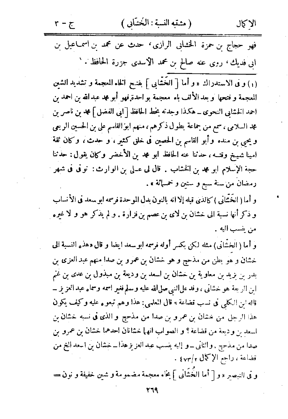 وأما "الخِشّاني" مثله لكن بكسر أوله فرسمه أبو سعد أيضا وقال "هذه النسبة إلى خشان وهو بطن من مذحج وهو خشان بن عمرو بن صدا منهم عبد العزى بن بدر بن يزيد بن معاوية بن خشان بن أسعد بن وديعة بن مبذول بن عدي بن غنم بن الربعة هو خشاني، وفد على النبي صلى الله عليه وسلم فغير اسمه وسماه عبد العزيز -قاله بن الكلبي في نسب قضاعة" قال المعلمي: هذا وهو تبعوه عليه وكيف يكون هذا الرجل من خشان بن عمرو بن صدا من مذحج والذي في نسبه خشان بن أسعد بن وديعة بن قضاعة؟ والصواب أنهما خشانان أحدهما خشان بن عمرو بن صدا من مذحج. والثاني -وإليه ينسب عبد العزيز هذا- خشان بن أسعد إلخ من قضاعة، راجع الإكمال 2/ 473.