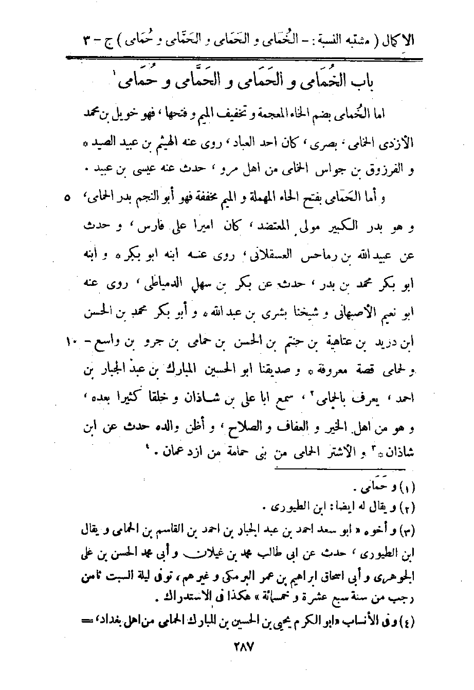 وأما الحمامي بفتح الحاء المهملة والميم مخففة فهو أبو النجم بدر الحمامي، وهو بدر الكبير مولى المعتضد، كان أميراً على فارس، وحدث عن عبيد الله بن رماحس العسقلاني، روى عنه ابنه أبو بكر وابنه أبو بكر محمد بن بدر، حدث عن بكر بن سهل الدمياطي، روى عنه أبو نعيم الأصبهاني وشيخنا بشرى بن عبد الله وأبو بكر محمد بن الحسن بن دريد بن عتاهية بن حنتم بن الحسن بن حمامي بن جرو بن واسع - ولحمامي قصة معروفة وصديقنا أبو الحسين المبارك بن عبد الجبار بن أحمد، يعرف بالحمامي2، سمع أبا علي بن شاذان وخلقاً كثيراً بعده، وهو من أهل الخير والعفاف والصلاح، وأظن والده حدث عن ابن شاذان3 والأشتر الحمامي من بني حمامة من أزد عمان4.