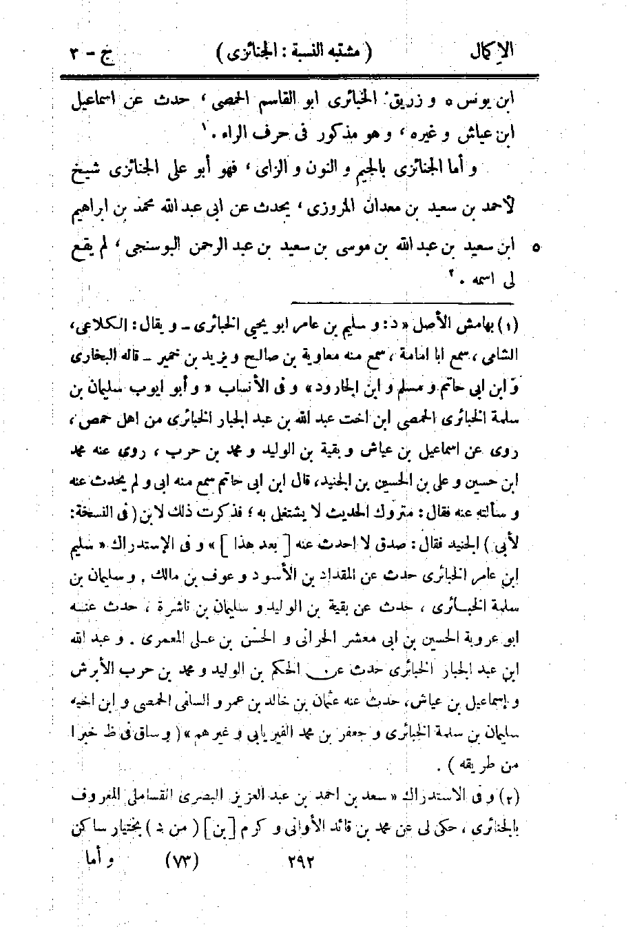 1 بهامش الأصل "د: وسليم بن عامر أبو يحيى الخبائري -ويقال: الكلاعي، الشامي، سمع أبا أمامة، سمع منه معاوية بن صالح ويزيد بن خمير -قاله البخاري وابن أبي حاتم ومسلم وابن الجارود" وفي الأنساب "وأبو أيوب سليمان بن سلمة الخبائري الحمصي بن أخت عبد الله بن عبد الجبار الخبائري من أهل حمص، روى عن إسماعيل بن عياش وبقية بن الوليد ومحمد بن حرب، روى عنه محمد بن حسين وعلي بن الحسين بن الجنيد، قال ابن أبي حاتم سمع منه أبي ولم يحدث عنه وسألته عنه فقال: متروك الحديث لا يشتغل به؛ فذكرت ذلك لابن "في النسخة: لأبي" الجنيد فقال: صدق لا أحدث عنه "بعد هذا"" وفي الاستدراك "سليم بن عامر الخبائري حدث عن المقداد بن الأسود وعوف بن مالك. وسليمان بن سلمة الخبائري، حدث عن بقية بن الوليد وسليمان بن ناشرة، حدث عنه أبو عروبة الحسين بن أبي معشر الحراني والحسن بن علي المعمري. وعبد الله بن عبد الجبار الخبائري حدث عن الحكم بن الوليد ومحمد بن حرب الأبرش وإسماعيل بن عياش، حدث عنه عثمان بن خالد بن عمر والسلفي الحمصي وبن أخيه سليمان بن سلمة الخبائري وجعفر بن محمد الفيريابي وغيرهم" "وساق في ظ خبرا من طريقه".