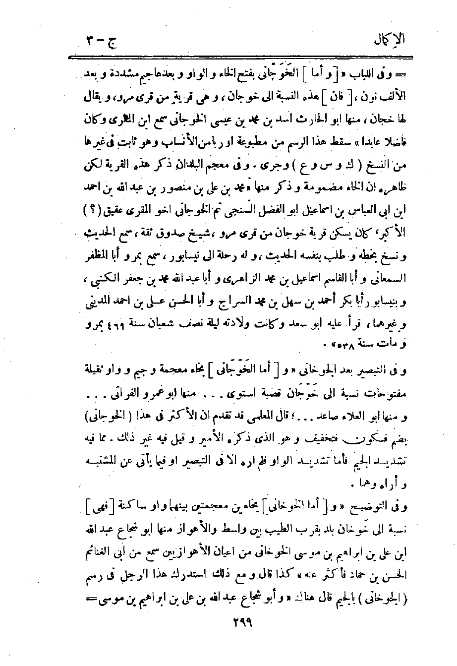 وفي التبصير بعد الجوخاني "و"أما الخَوّجَاني" بخاء معجمة وجيم وواو ثقيلة مفتوحات نسبة إلى خَوّجَان قصبة استوى ... منها ابو عمرو الفراتي ... ومنها أبو العلاء صاعد ... ؛ قال المعلمي قد تقدم أن الأكثر في هذا "الخوجاني" بضم فسكون فتخفيف وهو الذي ذكره الأمير وقيل فيه غير ذلك. مما فيه تشديد الجيم فأما تشديد الواو فلم أره إلا في التبصير أو فيما يأتي عن المشتبه وأراه وهما.