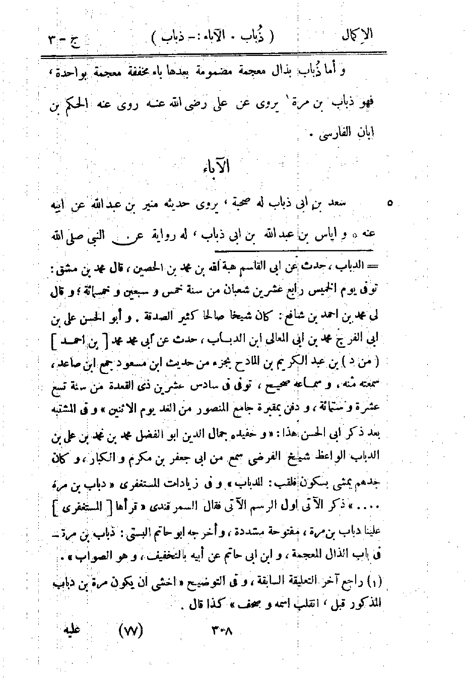 = الدباب، حدث عن أبي القاسم هبة الله بن محمد بن الحصين، قال محمد بن مشق: توفي يوم الخميس رابع عشرين شعبان من سنة خمس وسبعين وخمسمائة؛ وقال لي محمد بن أحمد بن شافع: كان شيخا صالحا كثير الصدقة. وأبو الحسن علي بن أبي الفرج محمد بن أبي المعالي بن الدباب، حدث عن أبي محمد محمد "بن أحمد" "من د" بن عبد الكريم بن المادح بجزء من حديث ابن مسعود جمع ابن صاعد، سمعته منه، وسماعه صحيح، توفي في سادس عشرين ذي القعدة من سنة تسع عشرة وستمائة، ودفن بمقبرة جامع المنصور من الغد يوم الاثنين" وفي المشتبه بعد ذكر أبي الحسن هذا: "وحفيده جمال الدين أبو الفضل محمد بن محمد بن علي بن الدباب الواعظ شيخ الفرضي سمع من أبي جعفر بن مكرم والكبار، وكان جدهم يمشي بسكون فلقب: الدباب" وفي زيادات المستغفري "دباب بن مرة...." ذكر الآتي أول الرسم الآتي فقال السمرقندي: "قرأها"المستغفري" علينا دباب بن مرة، مفتوحة مشددة، وأخرجه أبو حاتم البستي: ذباب بن مرة -في باب الذال المعجمة، وابن أبي حاتم عن أبيه بالتخفيف، وهو الصواب".