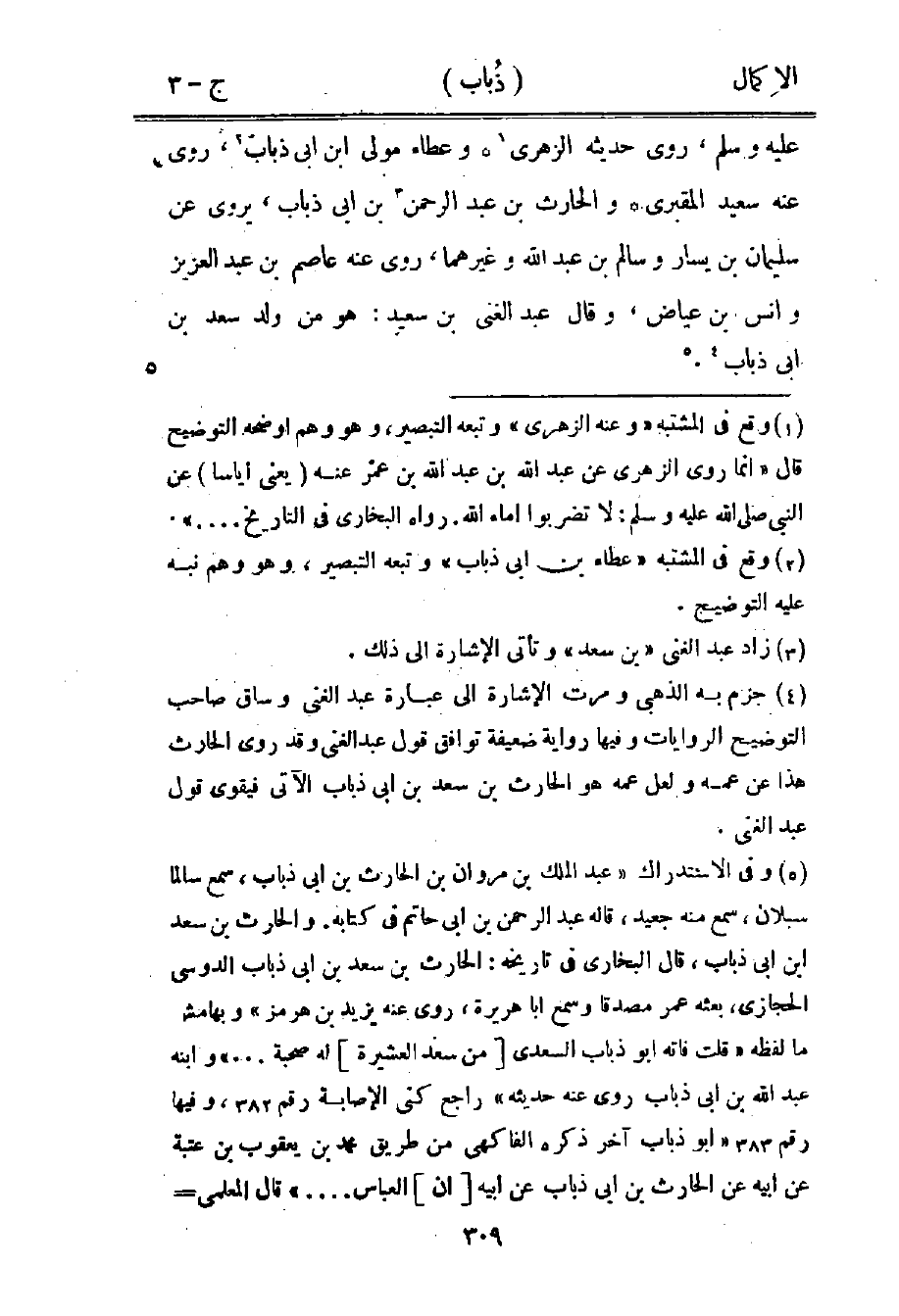 5 وفي الاستدراك "عبد الملك بن مروان بن الحارث بن أبي ذباب، سمع سالما سبلان، سمع منه جعيد، قاله عبد الرحمن بن أبي حاتم في كتابه. والحارث بن سعد بن أبي ذباب، قال البخاري في تاريخه: الحارث بن سعد بن أبي ذباب الدوسي الحجازي، بعثه عمر مصدقا وسمع أبا هريرة، روى عنه يزيد بن هرمز" وبهامش ما لفظه "قلت فاته أبو ذباب السعدي "من سعد العشيرة" له صحبة ... " وابنه عبد الله بن أبي ذباب روى عنه حديثه" راجع كنى الإصابة رقم 382، وفيها رقم 383 "أبو ذباب آخر ذكره الفاكهي من طريق محمد بن يعقوب بن عتبة عن أبيه عن الحارث بن أبي ذباب عن أبيه "أن" العباس...." قال المعلمي إن صح هذا فأراه الحارث بن سعد بن أبي ذباب نسب إلى جده.