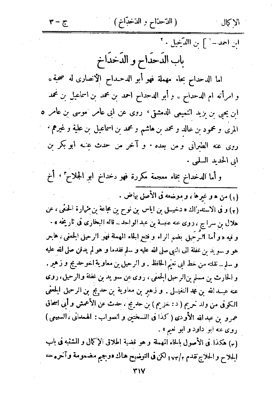 2 وفي الاستدراك "دخيل بن إياس بن نوح بن مجاعة بن مرارة الحنفي، عن هلال بن سراج، روى عنه عنبسة بن عبد الواحد -قاله البخاري في تاريخه". وفيه "وأما الرحيل بضم الراء وفتح الحاء المهملة فهو الرحيل الجعفي، هاجر هو وسويد بن غفلة إلى النبي صلى الله عليه وسلم فقدما وهو لم يدفن صلى الله عليه وسلم -نقلته من خط أبي نعيم الحافظ. والرحيل بن معاوية أخو حديج وزهير. والحارث بن مسلم بن الرحيل الجعفي، روى عن سويد بن غفلة والرحيل، روى عنه عبد الله بن محمد النفيلي. وزهير بن معاوية بن حديج بن الرحيل الجعفي الكوفي من ولد خريم "د: خزيم" بن حديج، حدث عن الأعمش وأبي إسحاق عمرو بن عبد الله الأودي "كذا في النسختين والصواب: الهمداني، السبيعي" روى عنه أبو داود وأبو نعيم".