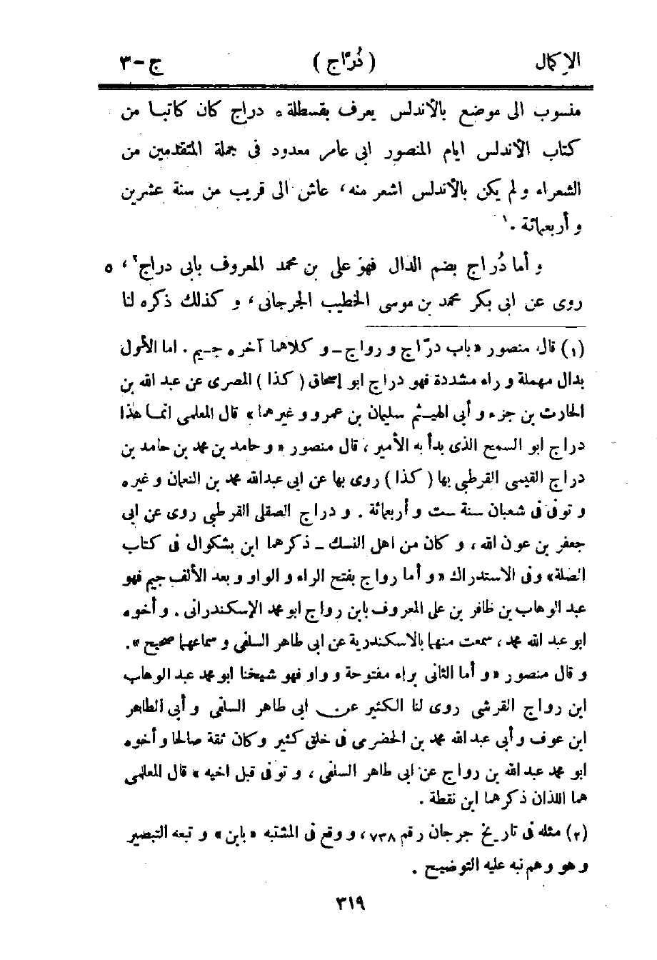1 قال منصور "باب درّاج ورواج -وكلاهما آخره جيم. أما الأول بدال مهملة وراء مشددة فهو دراج أبو إسحاق "كذا" المصري عن عبد الله بن الحارث بن جزء وأبي الهيثم سليمان بن عمرو وغيرهما" قال المعلمي إنما هذا دراج أبو السمح الذي بدأ به الأمير، قال منصور "وحامد بن محمد بن حامد بن دراج القيسي القرطبي بها "كذا" روى بها عن أبي عبد الله محمد بن النعمان وغيره وتوفي في شعبان سنة ست وأربعمائة. ودراج الصقلي القرطبي روى عن أبي جعفر بن عون الله، وكان من أهل النسك -ذكرهما ابن بشكوال في كتاب الصلة" وفي الاستدراك "وأما رواج بفتح الراء والواو وبعد الألف جيم فهو عبد الوهاب بن ظافر بن علي المعروف بابن رواج أبو محمد الإسكندراني. وأخوه أبو عبد الله محمد، سمعت منهما بالأسكندرية عن أبي طاهر السلفي وسماعهما صحيح". وقال منصور "وأما الثاني براء مفتوحة وواو فهو شيخنا أبو محمد عبد الوهاب ابن رواج القرشي روى لنا الكثير عن أبي طاهر السلفي وأبي الطاهر ابن عوف وأبي عبد الله محمد بن الحضرمي في خلق كثير وكان ثقة صالحا وأخوه أبو محمد عبد الله بن رواج عن أبي طاهر السلفي، وتوفي قبل أخيه" قال المعلمي: هما اللذان ذكرهما ابن نقطة.