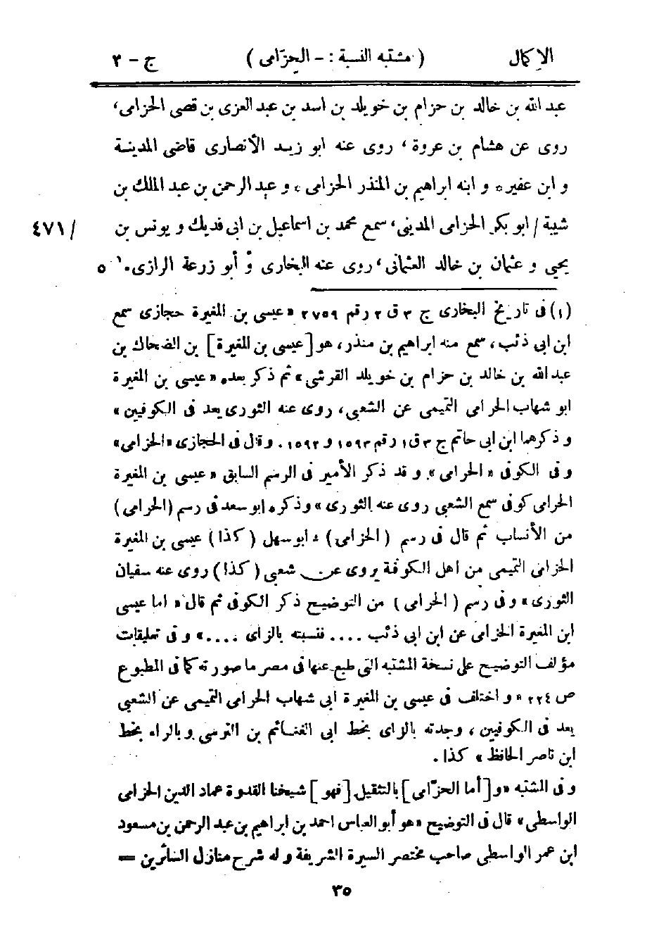 1 في تاريخ البخاري ج3 ق2 رقم 2759 "عيسى بن المغيرة حجازي سمع ابن أبي ذئب، سمع منه إبراهيم بن منذر، هو "عيسى بن المغيرة" بن الضحاك بن عبد الله بن خالد بن حزام بن خويلد القرشي" ثم ذكر بعده "عيسى بن المغيرة أبو شهاب الحرامي التميمي عن الشعبي، روى عنه الثوري يعد في الكوفيين" وذكرهما ابن أبي حاتم ج3 ق1 رقم 1593 و1592. وقال في الحجازي "الحزامي" وفي الكوفي "الحرامي" وقد ذكر الأمير في الرسم السابق "عيسى بن المغيرة الحرامي كوفي سمع الشعبي روى عنه الثوري" وذكره أبو سعد في رسم "الحرامي" من الأنساب ثم قال في رسم "الحزامي" أبو سهل "كذا" عيسى بن المغيرة الحزامي التميمي من أهل الكوفة يروي عن شعبي "كذا" روى عنه سفيان الثوري" وفي رسم "الحرامي" من التوضيح ذكر الكوفي ثم قال" أما عيسى ابن المغيرة الحزامي عن ابن أبي ذئب ... فنسبته بالزاي...." وفي تعليقات مؤلف التوضيح على نسخة المشتبه التي طبع عنها في مصر ما صورته كما في المطبوع ص224 "واختلف في عيسى بن المغيرة أبي شهاب الحرامي التميمي عن الشعبي يعد في الكوفيين، وجدته بالزاي بخط أبي الغنائم بن النرسي وبالراء بخط ابن ناصر الحافظ" كذا.