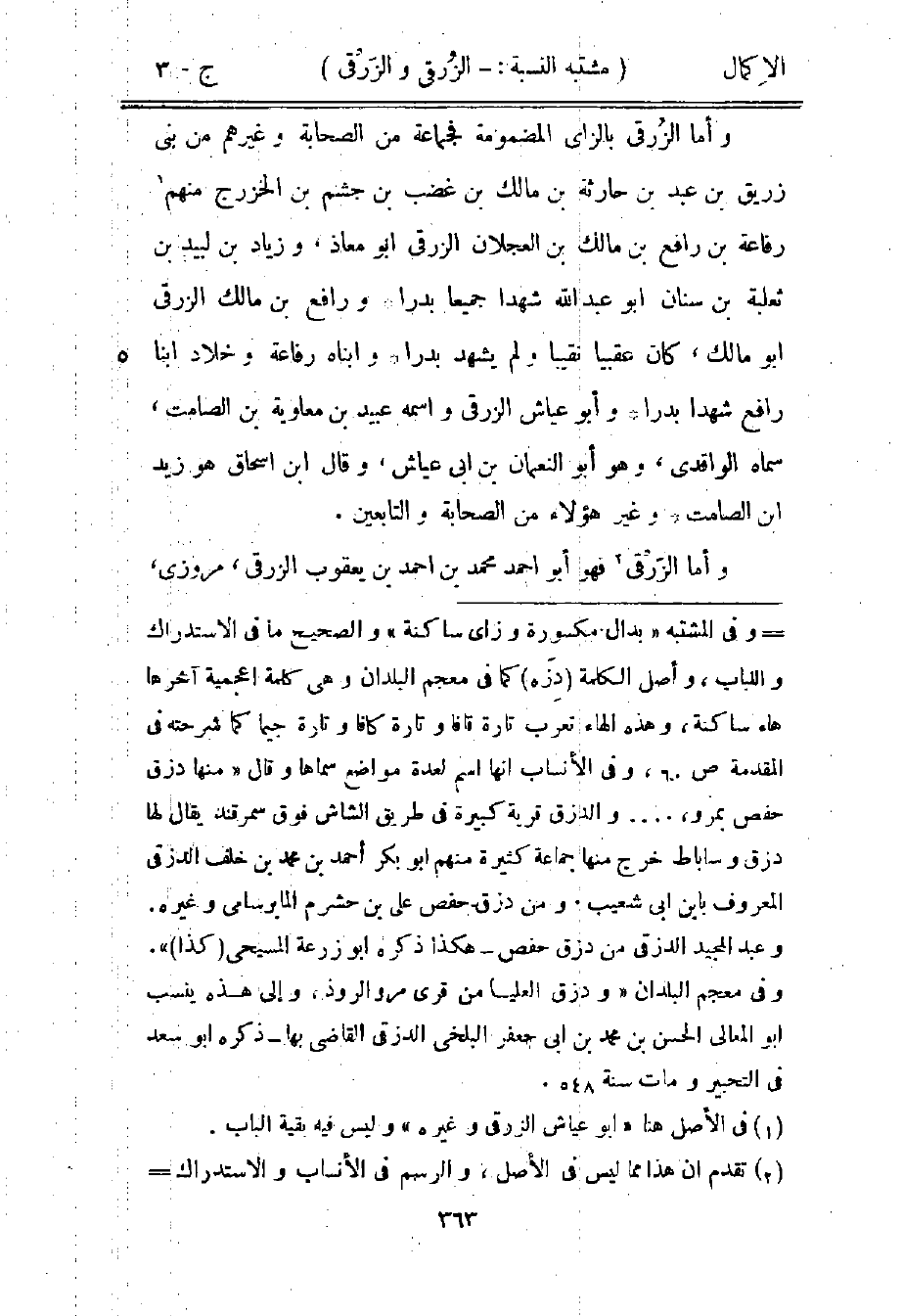 وأما الزرقى بالزاي المضمومة فجماعة من الصحابة وغيرهم من بني زريق بن عبد بن حارثة بن مالك بن غضب بن جشم بن الخزرج منهم1 رفاعة بن رافع بن مالك بن العجلان الزرقى أبو معاذ، وزياد بن لبيد بن ثعلبة بن سنان أبو عبد الله شهدا جميعاً بدرا ورافع بن مالك الزرقى أبو مالك، كان عقبياً نقيباً ولم يشهد بدرا وابناه رفاعة وخلاد ابنا رافع شهدا بدرا وأبو عياش الزرقى واسمه عبيد بن معاوية بن الصامت، سماه الواقدي، وهو أبو النعمان بن أبي عياش، وقال ابن إسحاق هو زيد ابن الصامت وغيره هؤلاء من الصحابة والتابعين.