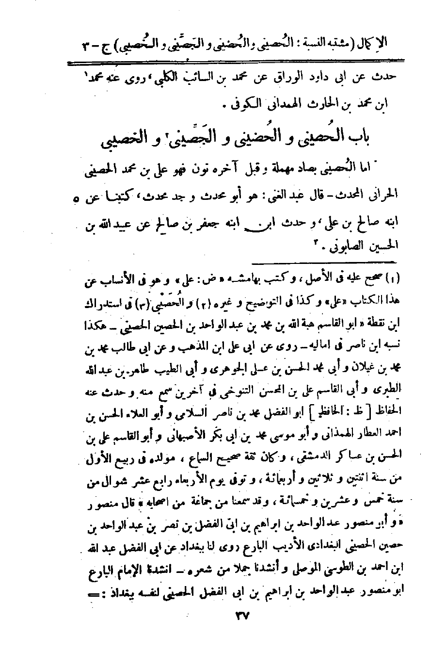 أما الحصيني بصاد مهملة وقبل آخره نون فهو علي بن محمد الحصيني الحراني المحدث، قال عبد الغني: هو أبو محدث وجد محدث، كتبنا عن ابنه صالح بن علي، وحدث ابن ابنه جعفر بن صالح عن عبيد الله بن الحسين الصابوني2.