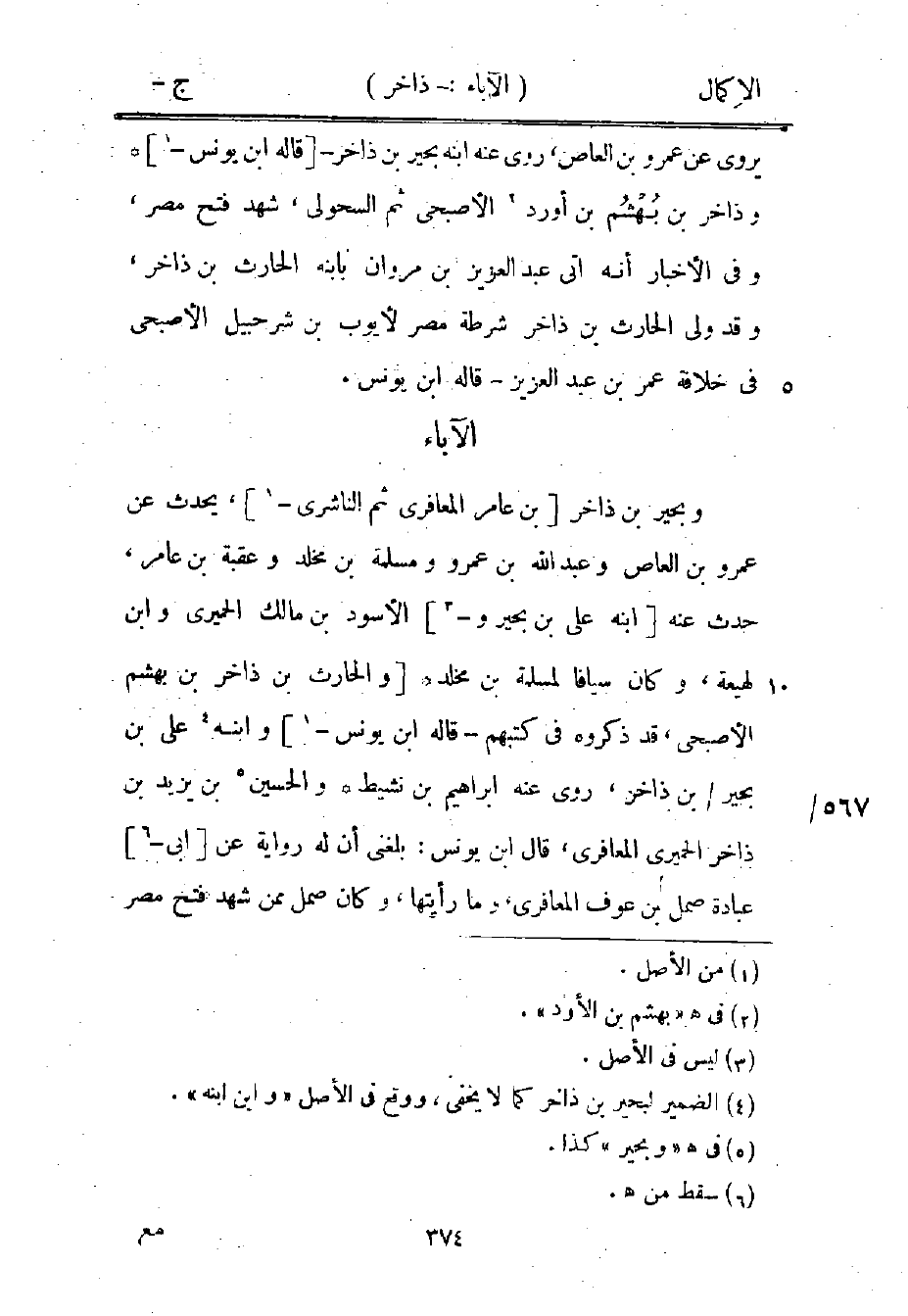 وبحير بن ذاخر "بن عامر المعافري ثم الناشري -1"، يحدث عن عمرو بن العاص وعبد الله بن عمرو ومسلمة بن مخلد وعقبة بن عامر، حدث عنه "ابنه علي بن بحيرو -3" الأسود بن مالك الحميري وابن لهيعة، وكان سيافاً لمسلمة بن مخلد "والحارث بن ذاخر بن بهشم الأصبحي، قد ذكروه في كتبهم - قاله ابن يونس -1" وابنه4 علي بن بحير بن ذاخر، روى عنه إبراهيم بن نشيط والحسين5 بن يزيد بن ذاخر الحمير المعافري، قال ابن يونس: بلغني أن له رواية عن "أبي -6" عبادة صمل بن عوف المعافري، وما رأيتها، وكان صمل ممن شهد فتح مصر مع عمرو بن العاص7.