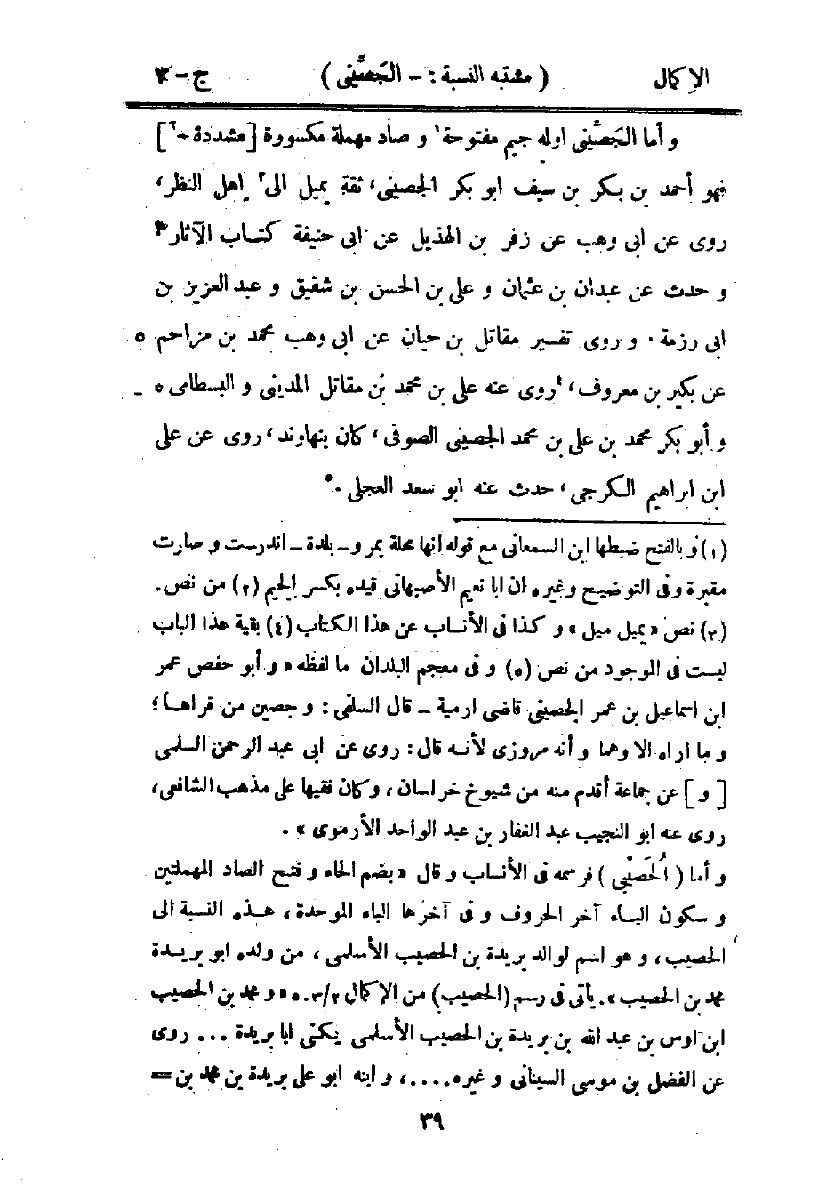 وأما الجصيني أوله جيم مفتوحة1 وصاد مهملة مكسورة "مشددة2" فهو أحمد بن بكر بن سيف أبو بكر الجصيني، ثقة يميل إلى3 أهل النظر، روى عن أبي وهب عن زفر بن الهذيل عن أبي حنيفة كتاب الآثار وحدث عن عبدان بن عثمان وعلي بن الحسن بن شقيق وعبد العزيز بن أبي رزمة. وروى تفسير مقاتل بن حيان عن أبي وهب محمد بن مزاحم عن بكير بن معروف4، روى عنه علي بن محمد بن مقاتل المديني والبسطامي وأبو بكر محمد بن علي بن محمد الجصيني الصوفي، كان بنهاوند، روى عن علي بن إبراهيم الكرجي، حدث عنه أبو سعد العجلي5.
