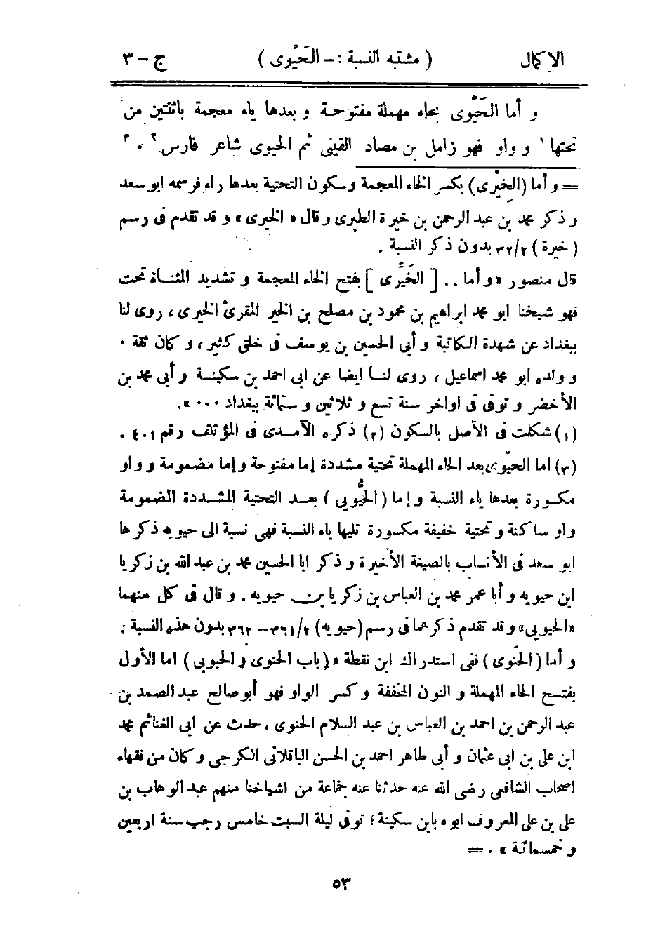 3 إما الحيوي بعد الحاء المهملة تحتية مشددة إما مفتوحة وإما مضمومة وواو مكسورة بعدها ياء النسبة وإما "الحيويي" بعد التحتية المشددة المضمومة واو ساكنة وتحتية خفيفة مكسورة تليها ياء النسبة فهي نسبة إلى حيويه ذكرها أبو سعد في الأنساب بالصيغة الأخيرة وذكر أبا الحسين محمد بن عبد الله بن زكريا ابن حيويه وأبا عمر محمد بن العباس بن زكريا بن حيويه. وقال في كل منهما "الحيويي" وقد تقدم ذكرهما في رسم "حيويه" 2/ 361-362 بدون هذه النسبة. وأما "الحنوي" ففي استدراك ابن نقطة "باب الحنوي والحبوبي" أما الأول بفتح الحاء المهملة والنون المخففة وكسر الواو فهو أبو صالح عبد الصمد بن عبد الرحمن بن أحمد بن العباس بن عبد السلام الحنوي، حدث عن أبي الغنائم محمد بن علي بن أبي عثمان وأبي طاهر أحمد بن الحسن الباقلاني الكرجي وكان من فقهاء أصحاب الشافعي رضي الله عنه حدثنا عنه جماعة من أشياخنا منهم عبد الوهاب بن علي بن علي المعروف أبوه بابن سكينة، توفي ليلة السبت خامس رجب سنة أربعين وخمسمائة". =