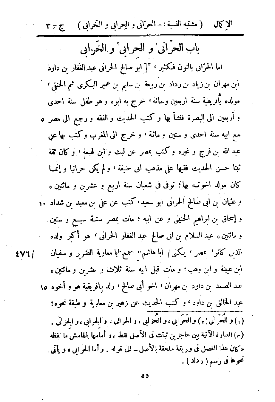 أما الحراني بالنون فكثير3، "أبو صالح الحراني عبد الغفار بن داود بن مهران بن زياد بن رداد بن ربيعة بن سليم بن عمير البكري ثم الحنفي، مولده بأفريقية سنة أربعين ومائة، خرج به أبوه وهو طفل سنة إحدى وأربعين إلى البصرة فنشأ بها وكتب الحديث والفقه ورجع إلى مصر مع أبيه سنة إحدى وستين ومائة، وخرج إلى المغرب وكتب بها عن عبد الله بن فرج وغيره وكتب بمصر عن ليث وابن لهيعة، وكان ثقة ثبتا حسن الحديث فقيها على مذهب أبي حنيفة، ولم يكن حرانيا وإنما كان مولد إخوته بها؛ توفي في شعبان سنة أربع وعشرين ومائتين وعثمان بن أبي صالح الحراني أبو سعيد، كتب عن علي بن معبد بن شداد وإسحاق بن إبراهيم الحنيني وعن أبيه؛ مات بمصر سنة سبع وستين ومائتين بن إبراهيم الحنيني وعن أبيه؛ مات بمصر سنة سبع وستين ومائتين عبد السلام بن أبي صالح عبد الغفار الحراني، هو أكبر ولده الذين كانوا بمصر، يكنى أبا هاشم، سمع أبا معاوية الضرير وسفيان بن عيينة وابن وهب؛ ومات قبل أبيه سنة ثلاث وعشرين ومائتين عبد الصمد بن داود بن مهران، أخو أبي صالح، ولد بأفريقية هو وأخوه عبد الخالق بن داود، وكتب الحديث عن زهير بن معاوية وطبقة نحوه؛