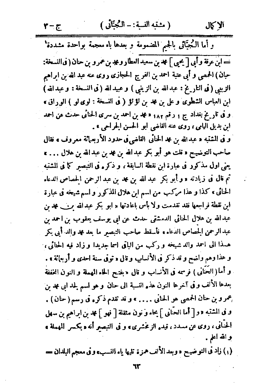 وفي المشتبه "عبد الله بن محمد الحنائي القاضي في حدود الأربعمائة معروف" فقال صاحب التوضيح "قلت هو أبو بكر عبد الله بن محمد بن عبد الله بن هلال ... " يعني أول مذكور في عبارة ابن نقطة السابقة، وذكره في التبصير كما في المشتبه ثم قال في زيادته "وأبو بكر عبد الله بن محمد بن عبد الرحمن الجصاص الدعاء الحنائي" كذا وهذا مركب من اسم ابن هلال المذكور واسم شيخه في عبارة ابن نقطة فراجعها فقد تقدمت ولا بأس بإعادتها "أبو بكر عبد الله بن محمد بن عبد الله بن هلال الحنائي الدمشقي حدث عن أبي يوسف يعقوب بن أحمد بن عبد الرحمن الجصاص الدعاء" فأسقط صاحب التبصير ما بعد محمد والد أبي بكر هذا إلى أحمد والد شيخه وركب من الباقي اسما جديدا وزاد فيه الحنائي، وهذا وهم واضح وقد ذكر في الأنساب وقال "توفي سنة إحدى وأربعمائة". وأما "الحنائي" فرسمه في الأنساب وقال "بفتح الحاء المهملة والنون المخففة بعدها الألف وفي آخرها النون هذه النسبة إلى حنان وهو اسم لجد أبي محمد بن عمرو بن حنان الحمصي هو الحناني...." وقد تقدم ذكره في رسم "حنان" وفي المشتبه "و" أما الحناني" بحاء ونون مثقلة "فهو" محمد بن إبراهيم بن سهل الحناني، روى عن مسدد، قيده الزمخشري" وفي التبصير أنه "بكسر المهملة" والله أعلم.