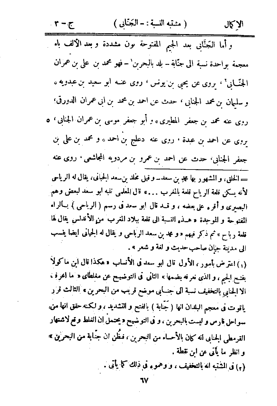1 اعترض بأمور، الأول قال أبو سعد في الأنساب "هكذا قال ابن ماكولا بفتح الجيم والذي نعرفه بضمها" الثاني في التوضيح عن مغلطاي "ما أعرف الإ الجنابي بالتخفيف نسبة إلى جنابي موضع قريب من البحرين" الثالث قرر ياقوت في معجم البلدان أنها "جنابة" بالفتح والتشديد، ولكنه حقق أنها من سواحل فارس وليست بالبحرين وفي التوضيح "يحتمل أن الغلط وقع لاشتهار القرمطي الجنابي أنه كان بالأحساء من البحرين، فظن أن جنابة من البحرين" وانظر ما يأتي عن ابن نقطة.