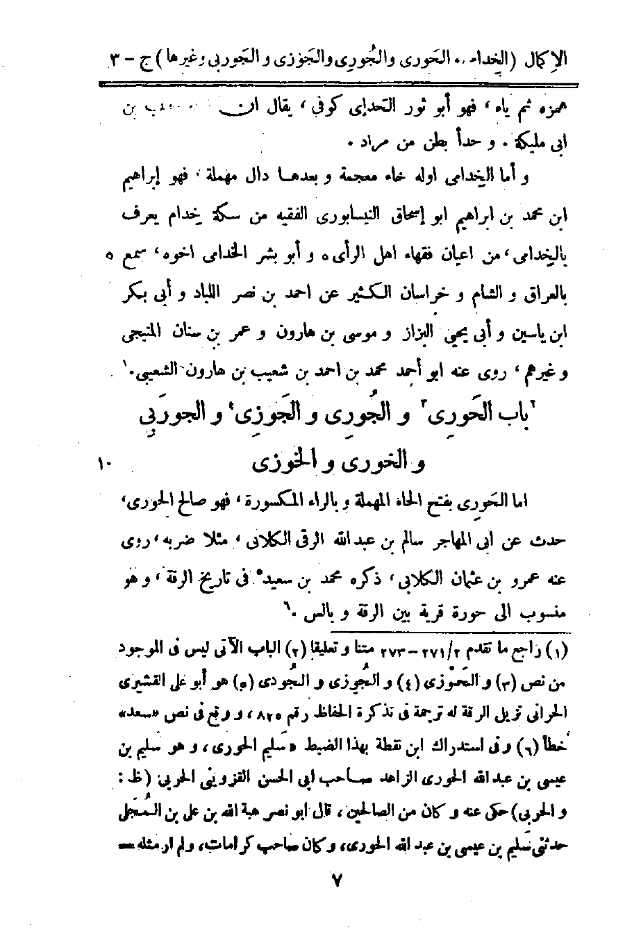 أما الحوري بفتح الحاء المهملة وبالراء المكسورة، فهو صالح الحوري، حدث عن أبي المهاجر سالم بن عبد الله الرقي الكلابي، مثلًا ضربه، روى عنه عمرو بن عثمان الكلابي، ذكره محمد بن سعيد4 في تاريخ الرقة، وهو منسوب إلى حورة قرية بين الرقة وبالس5.