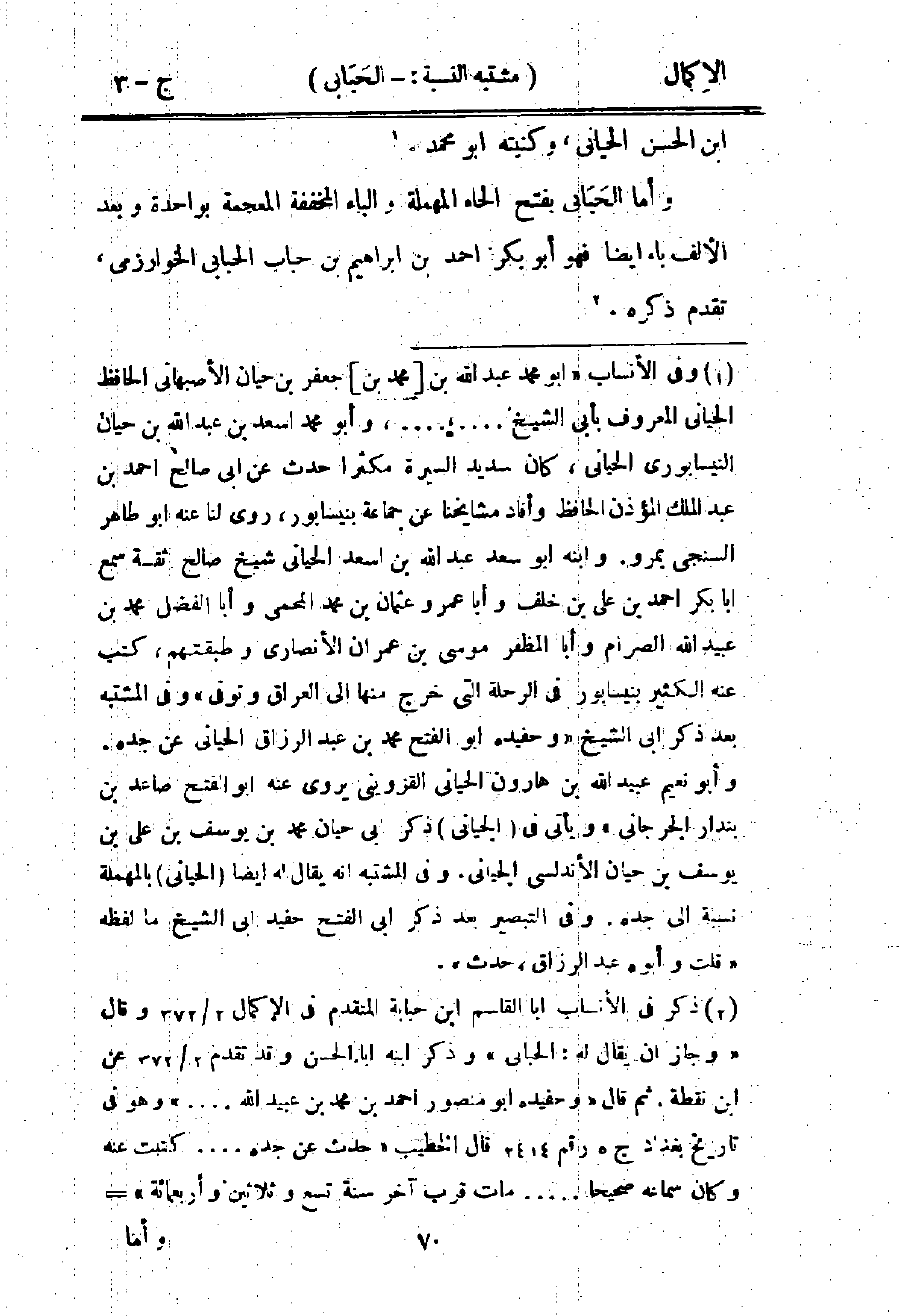1 وفي الأنساب "أبو محمد عبد الله "محمد بن" جعفر بن حيان الأصبهاني الحافظ الحياني المعروف بأبي الشيخ....،....، وأبو محمد أسعد بن عبد الله بن حيان النيسابوري الحياني، كان سديد السيرة مكثرا حدث عن أبي صالح أحمد بن عبد الملك المؤذن الحافظ وأفاد مشايخنا عن جماعة بنيسابور، روى لنا عنه أبو طاهر السنجي بمرو. وابنه أبو سعد عبد الله بن أسعد الحياني شيخ صالح ثقة سمع أبا بكر أحمد بن علي بن خلف وأبا عمرو عثمان بن محمد المحمي وأبا الفضل محمد بن عبيد الله الصرام وأبا المظفر موسى بن عمران الأنصاري وطبقتهم، كتب عنه الكثير بنيسابور في الرحلة التي يخرج منها إلى العراق وتوفي" وفي المشتبه بعد ذكر أبي الشيخ "وحفيده أبو الفتح محمد بن عبد الرزاق الحياني عن جده. وأبو نعيم عبيد الله بن هارون الحياني القزويني يروي عنه أبو الفتح صاعد بن بندار الجرجاني" ويأتي في "الجياني" ذكر أبي حيان محمد بن يوسف بن علي بن يوسف ين حيان الأندلسي الجياني. وفي المشتبه أنه يقال له أيضا "الحياني" بالمهملة نسبة إلى جده. وفي التبصير بعد ذكر أبي الفتح حفيد أبي الشيخ ما لفظه "قلت وأبوه عبد الرزاق، حدث".