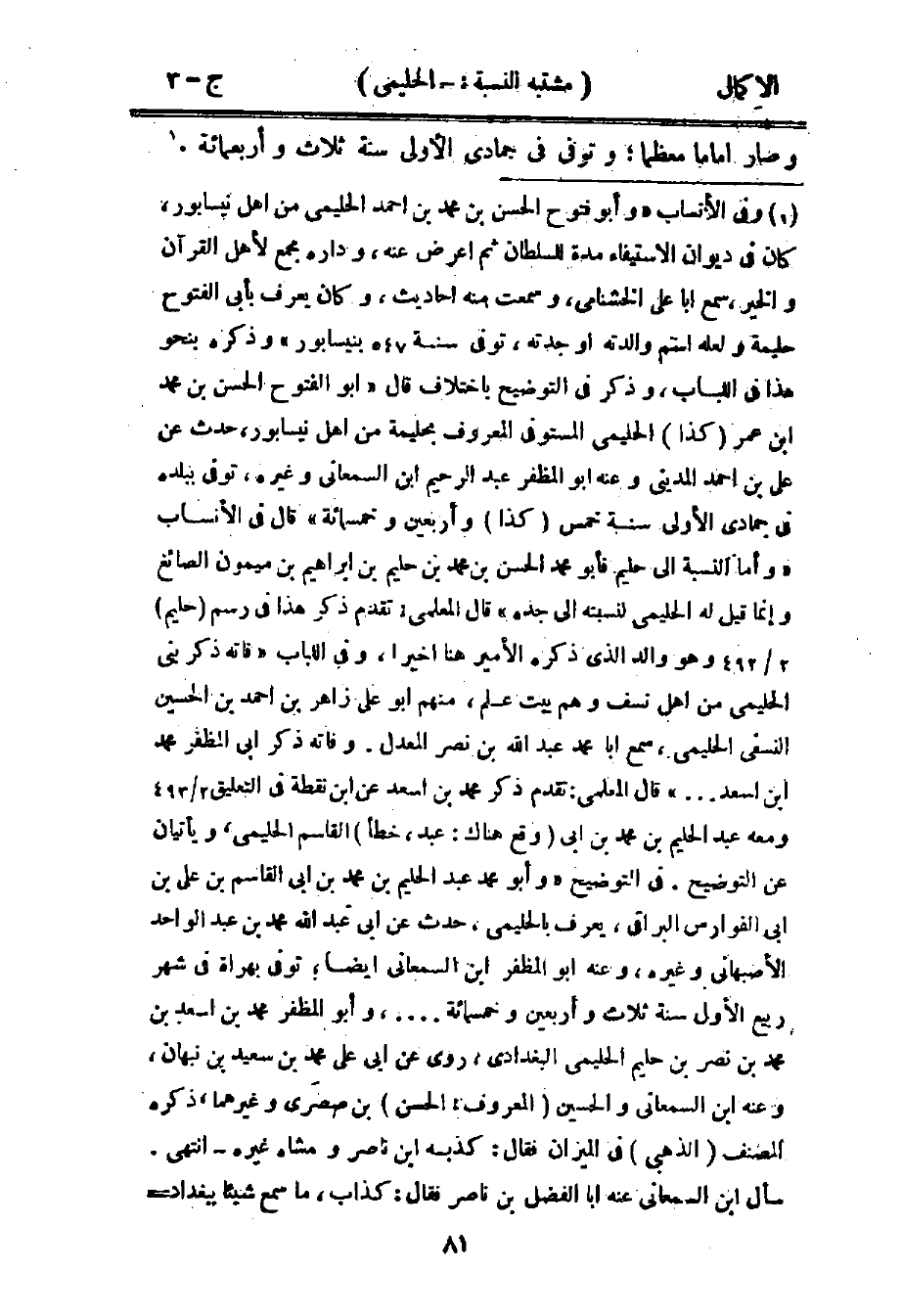 1 وفي الأنساب "وأبو فتوح الحسن بن محمد بن أحمد الحليمي من أهل نيسابور، كان في ديوان الاستيفاء مدة للسلطان ثم أعرض عنه، وداره مجمع لأهل القرآن والخير، سمع أبا علي الخشنامي، وسمعت منه أحاديث، وكان يعرف بأبي الفتوح حليمة ولعله اسم والدته أو جدته، توفي سنة 547 بنيسابور" وذكره بنحو هذا في اللباب، وذكر في التوضيح باختلاف قال: "أبو الفتوح الحسن بن محمد بن عمر "كذا" الحليمي المستوفي المعروف بحليمة من أهل نيسابور، حدث عن علي بن أحمد المديني وعنه أبو المظفر عبد الرحيم بن السمعاني وغيره، توفي ببلده في جمادى الأولى سنة خمس "كذا" وأربعين وخمسمائة" قال في الأنساب "وأما النسبة إلى حليم فأبو محمد الحسن بن محمد بن حليم بن إبراهيم بن ميمون الصائغ وإنما قيل له الحليمي لنسبته إلى جده" قال المعلمي تقدم ذكر هذا في رسم "حليم" 2/ 492 وهو والد الذي ذكره الأمير هنا أخيرا، وفي اللباب "فاته ذكر بني الحليمي من أهل نسف وهم بيت علم، منهم أبو علي زاهر بن أحمد بن الحسين النسفي الحليمي، سمع أبا محمد عبد الله بن نصر المعدل. وفاته ذكر أبي المظفر محمد بن أسعد ... " قال المعلمي: تقدم ذكر محمد بن أسعد عن ابن نقطة في التعليق 2/ 493 ومعه عبد الحليم بن محمد بن أبي "وقع هناك: عبد، خطأ" القاسم الحليمي، ويأتيان عن التوضيح. في التوضيح "وأبو محمد عبد الحليم عن محمد بن أبي القاسم بن علي بن أبي الفوارس البراقي، يعرف بالحليمي، حدث عن أبي عبد الله محمد بن عبد الواحد الأصبهاني وغيره، وعنه أبو المظفر ابن السمعاني أيضا؛ توفي بهراة في شهر ربيع الأول سنة ثلاث وأربعين وخمسمائة....، وأبو المظفر محمد بن أسعد بن محمد بن نصر بن حليم الحليمي البغدادي، روى عن أبي علي محمد بن سعيد بن نبهان، وعنه ابن السمعاني والحسين "المعروف: الحسن" بن صصرى وغيرهما، ذكره المصنف "الذهبي" في الميزان فقال: كذبه ابن ناصر ومشاه غيره، انتهى. سأل ابن السمعاني عنه أبا الفضل بن ناصر فقال: كذاب، ما سمع شيئا ببغداد ولا رأيناه مع أصحاب الحديث ولا في مجالس الشيوخ، وهو قاص يتسوق بهذا عند العوام، انتهى. وقال أبو الفتح عمر بن الحاجب في معجمه: يكنى أبا المظفر ويلقب بالمهذب، الشيعي الغاسل للروافض. شيخ فصيح العبارة حسن الإيراد كثير المحفوظ حلو الكلام إلا أنه كان ثقيلا على الفؤاد كثير الكلام فيما لا يعنيه. وقال: وكان يحفظ أشعارا مختلفة أكثرها في مثالب الصحابة رضوان الله عليهم".