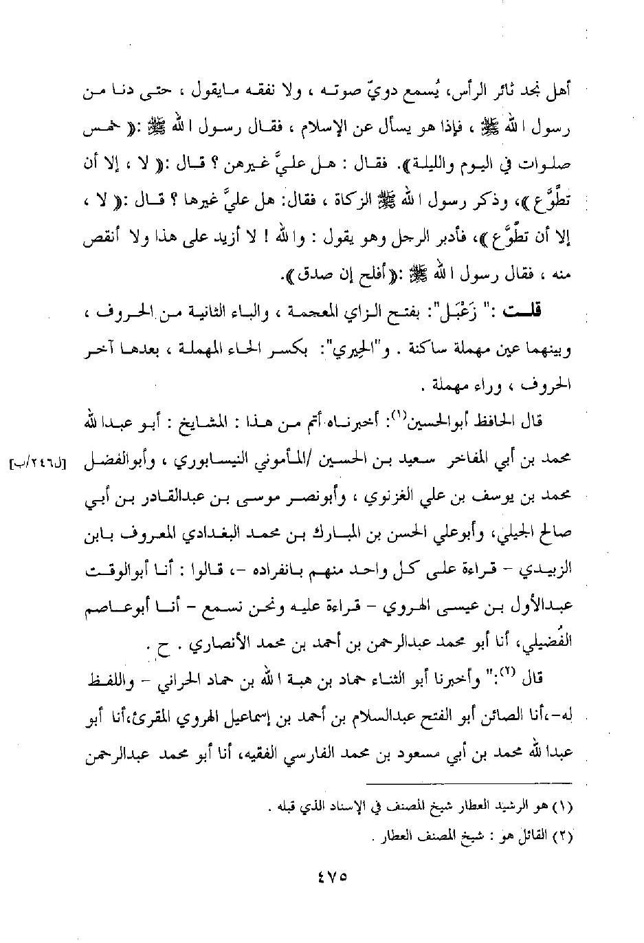 قال الحافظ أبو الحسين: أخبرناه أتم من هذا: المشايخ: أبو عبد الله محمد بن أبي المفاخر سعيد بن الحسين المأموني النيسابوري، وأبو الفضل محمد بن يوسف بن علي الغزنوي، وأبو نصر موسى بن عبد القادر بن أبي صالح الجيلي، وأبو علي الحسن بن المبارك بن محمد البغدادي المعروف بابن الزبيدي - قراءة على كل واحد منهم بانفراده -، قالوا: أنا أبو الوقت عبد الأول بن عيسى الهروي - قراءة عليه ونحن نسمع - أنا أبو عاصم الفضيلي، أنا أبو محمد عبد الرحمن بن أحمد بن محمد الأنصاري. ح.