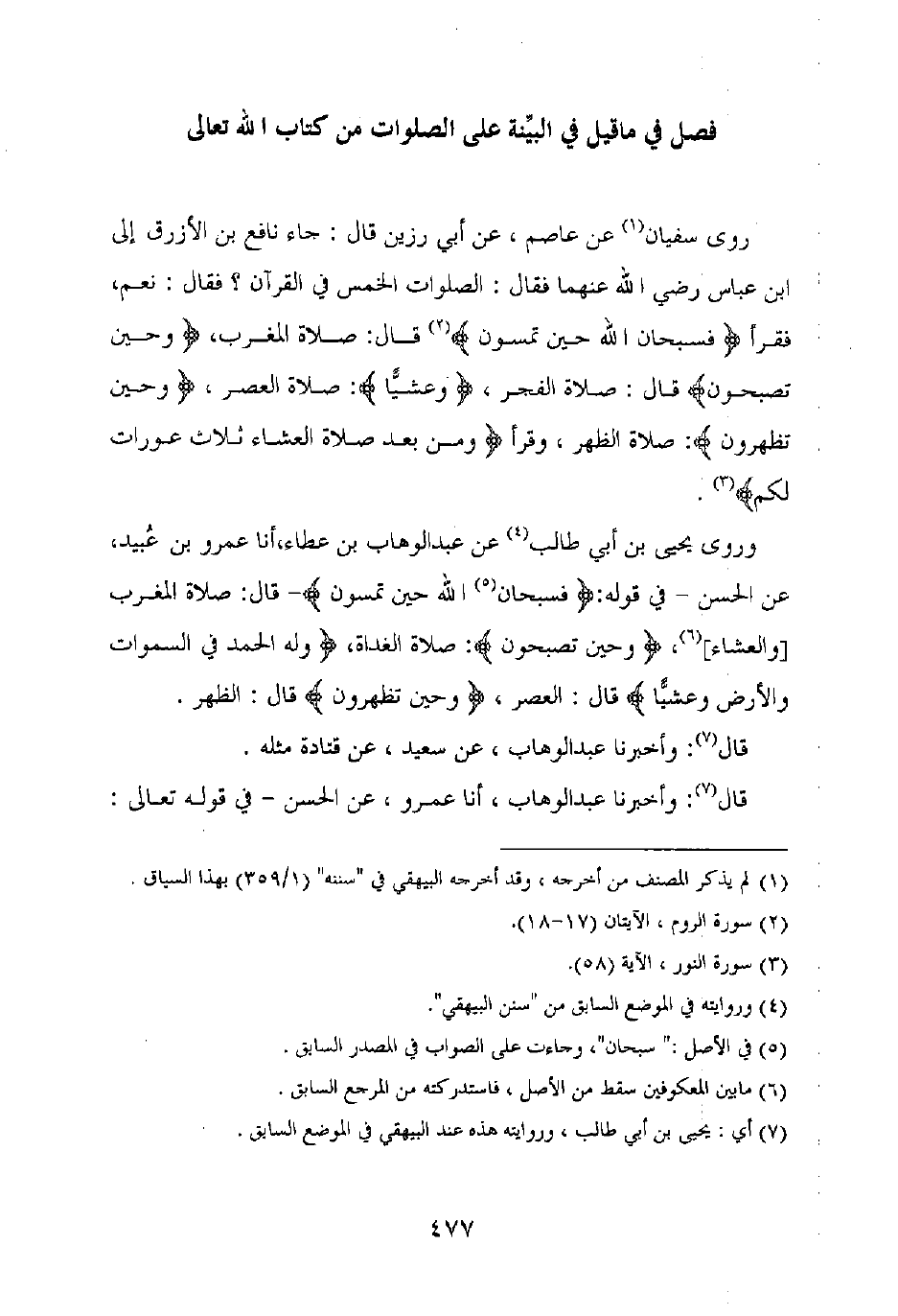 روى سفيان، عن عاصم، عن أبي رزين قال: جاء نافع بن الأزرق إلى ابن عباس رضي الله عنهما فقال: الصلوات الخمس في القرآن؟ فقال: نعم، فقرأ {فسبحان الله حين تمسون} قال: صلاة المغرب {وحين تصبحون} قال: صلاة الفجر، {وعشيا}: صلاة العصر، {وحين تظهرون}: صلاة الظهر، وقرأ {ومن بعد صلاة العشاء ثلاث عورات لكم}.