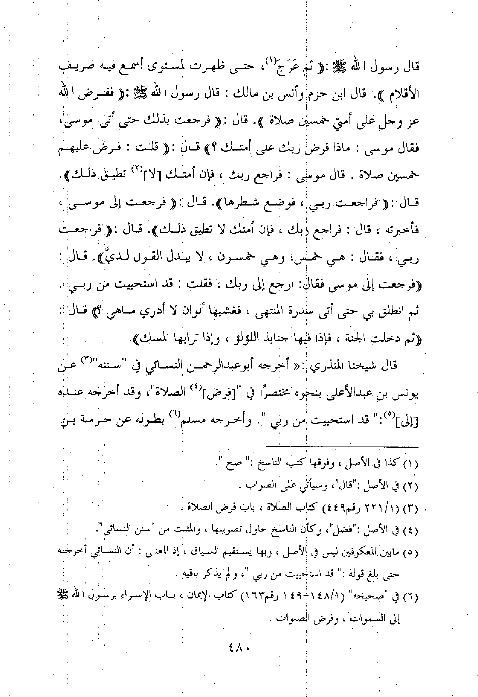 قال رسول الله صلى الله عليه وسلم: "ثم عرج، حتى ظهرت لمستوى أسمع فيه صريف الأقلام". قال ابن حزم وأنس بن مالك: قال رسول الله صلى الله عليه وسلم: "ففرض الله عز وجل على أمتي خمسين صلاة". قال: "فرجعت بذلك حتى أتى موسى، فقال موسى: ماذا فرض ربك على أمتك؟ " قال: "قلت: فرض عليهم خمسين صلاة. قال موسى: فراجع ربك، فإن أمتك [لا] تطيق ذلك".