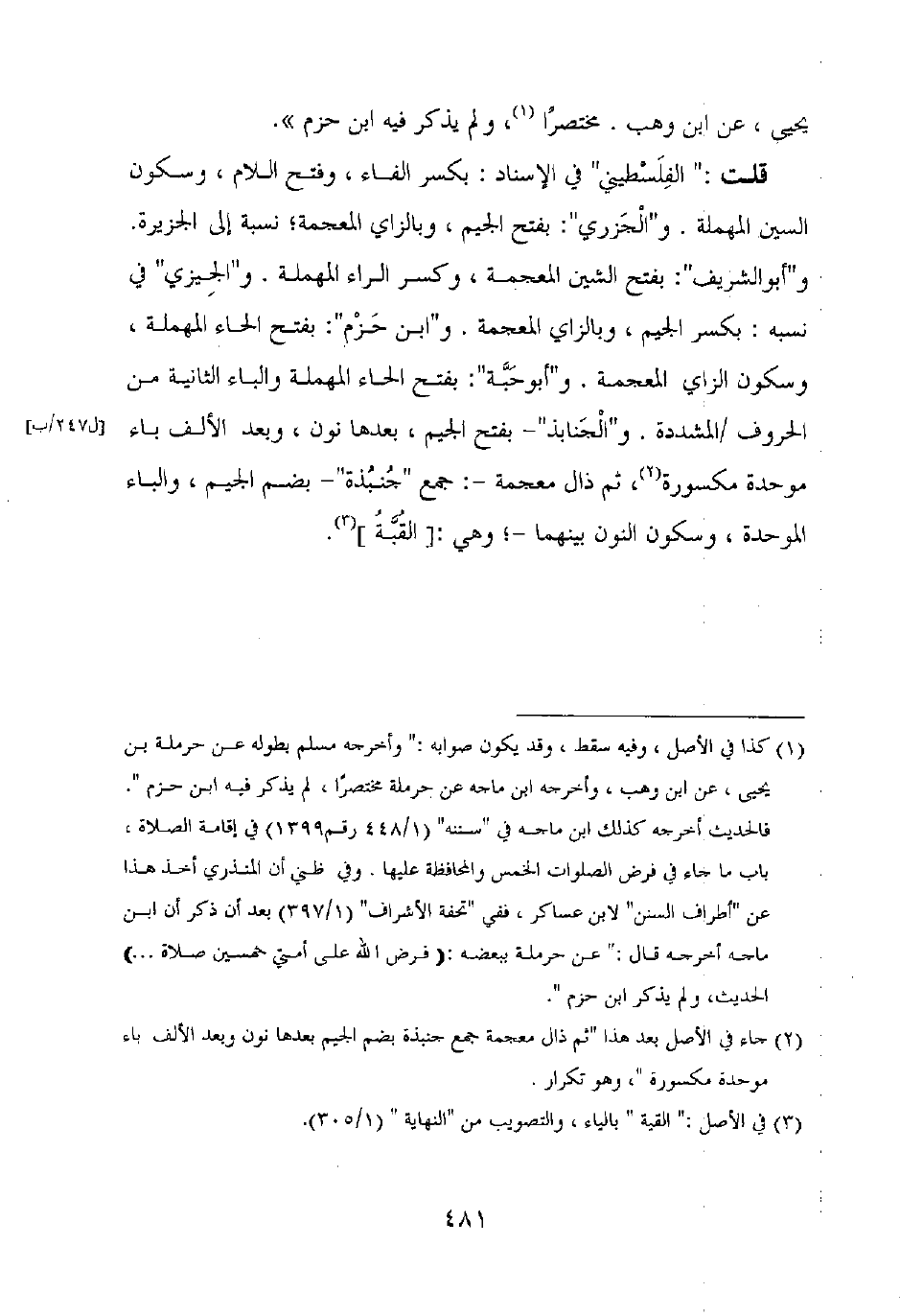 قلت: "الفلسطيني" في الإسناد: بكسر الفاء، وفتح اللام، وسكون السين المهملة. و"الجزري": بفتح الجيم، وبالزاي المعجمة، نسبة إلى الجزيرة. و"أبو الشريف": بفتح الشين المعجمة، وكسر الراء المهملة. و"الجيزي" في نسبه: بكسر الجيم، وبالزاي المعجمة. و"ابن حزم": بفتح الحاء المهملة، وسكون الزاي المعجمة. و "أبو حبة": بفتح الحاء المهملة والباء الثانية من الحروف المشددة. و"الجنابذ" – بفتح الجيم، بعدها نون، وبعد الألف باء موحدة مكسورة، ثم ذال معجمة –: جمع "جنبذة" – بضم الجيم، والباء الموحدة، وسكون النون بينهما –، وهي: [القبة].