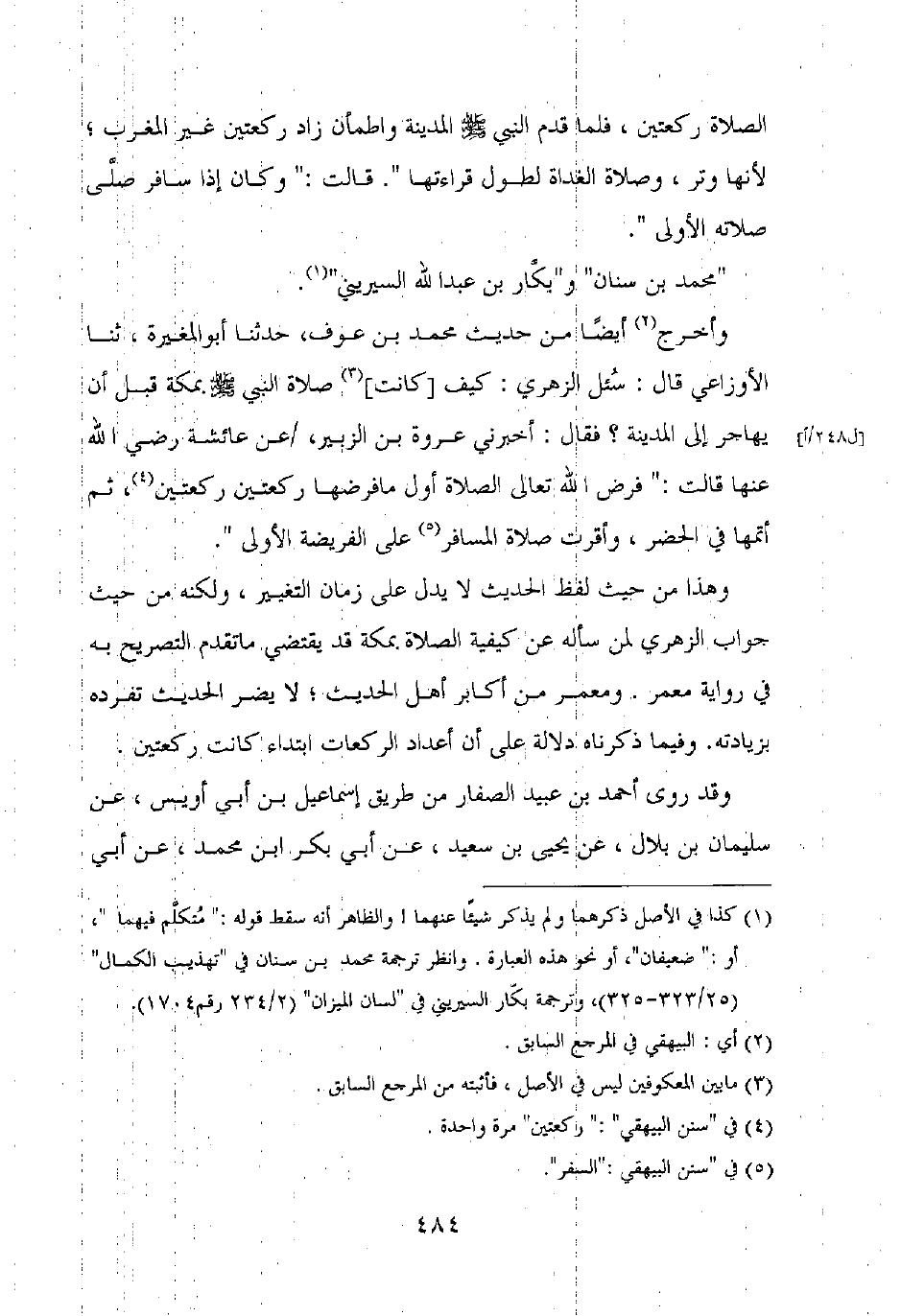وأخرج أيضا من حديث محمد بن عوف، حدثنا أبو المغيرة، ثنا الأوزاعي قال: سئل الزهري: كيف [كانت] صلاة النبي صلى الله عليه وسلم بمكة قبل أن يهاجر إلى المدينة؟ فقال: أخبرني عروة بن الزبير، عن عائشة رضي الله عنها قالت: "فرض الله تعالى الصلاة أول ما فرضها ركعتين ركعتين، ثم أتمها في الحضر، وأقرت صلاة المسافر على الفريضة الأولى".