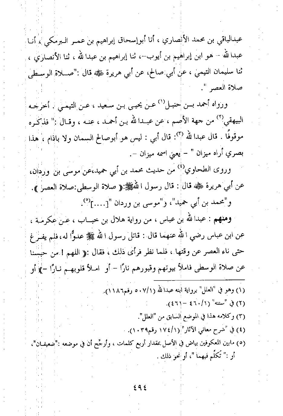 عبد الباقي بن محمد الأنصاري، أنا أبو إسحاق إبراهيم بن عمر البرمكي، أنا عبد الله – هو ابن إبراهيم بن أيوب –، ثنا إبراهيم بن عبد الله، ثنا الأنصاري، ثنا سليمان التيمي، عن أبي صالح، عن أبي هريرة رضي الله عنه قال: "صلاة الوسطى صلاة العصر".