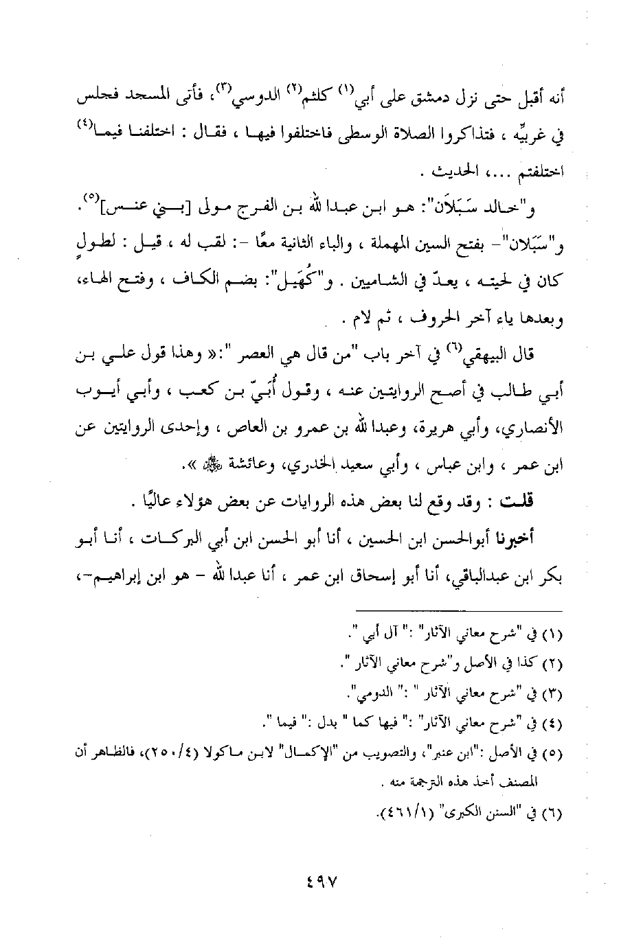 أنه أقبل حتى نزل دمشق على أبي كلثم الدوسي، فأتى المسجد فجلس في غربيه، فتذاكروا الصلاة الوسطى فاختلفوا فيها، فقال: اختلفنا فيما اختلفتم .... ، الحديث.