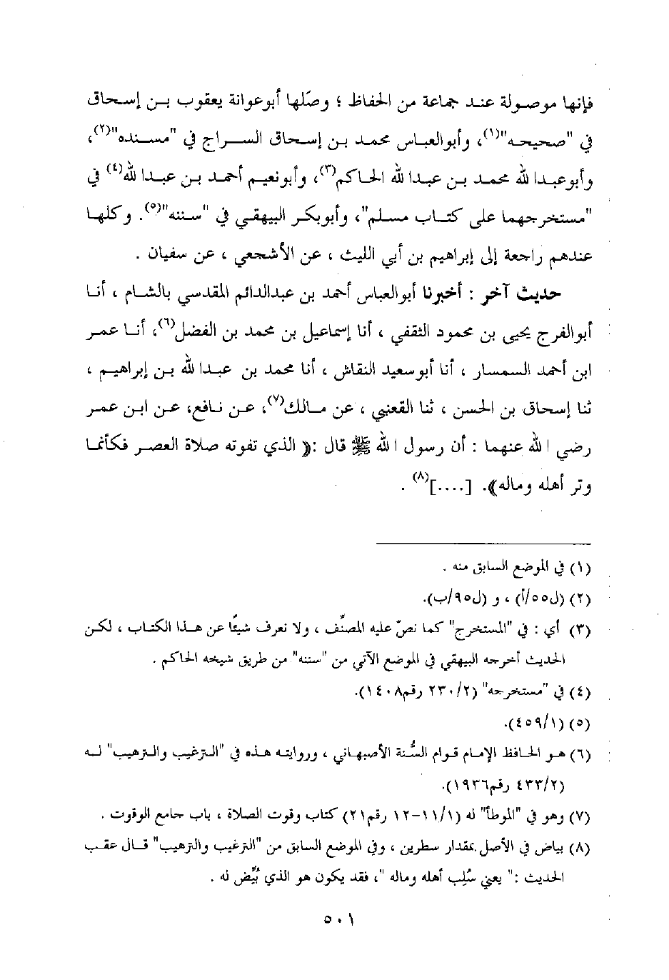 حديث آخر: أخبرنا أبو العباس أحمد بن عبد الدائم المقدسي بالشام، أنا أبو الفرج يحيى بن محمود الثقفي، أنا إسماعيل بن محمد بن الفضل، أنا عمر بن أحمد السمسار، أنا أبو سعيد النقاش، أنا محمد بن عبد الله بن إبراهيم، ثنا إسحاق بن الحسن، ثنا القعنبي، عن مالك، عن نافع، عن ابن عمر رضي الله عنهما: أن رسول الله صلى الله عليه وسلم قال: "الذي تفوته صلاة العصر فكأنما وتر أهله وماله". [ ....... ].