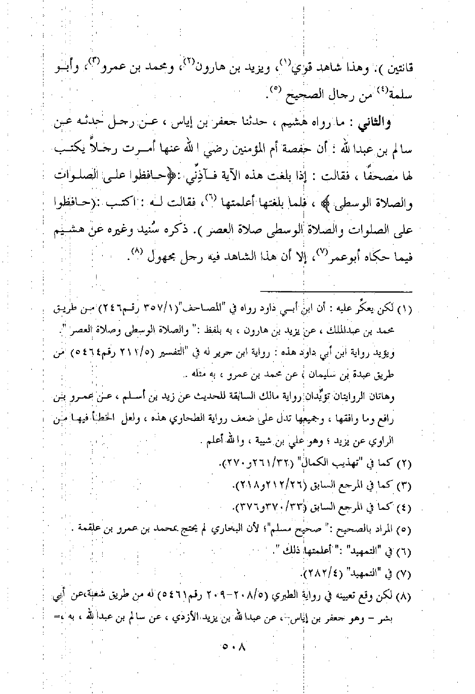 والثاني: ما رواه هشيم، حدثنا جعفر بن إياس، عن رجل حدثه عن سالم بن عبد الله: أن حفصة أم المؤمنين رضي الله عنها أمرت رجلا يكتب لها مصحفا، فقالت: إذا بلغت هذه الآية فآذني: {حافظوا على الصلوات والصلاة الوسطى}، فلما بلغتها أعلمتها، فقالت له: اكتب: (حافظوا على الصلوات والصلاة الوسطى صلاة العصر). ذكره سنيد وغيره عن هشيم فيما حكاه أبو عمر، إلا أن هذا الشاهد فيه رجل مجهول.