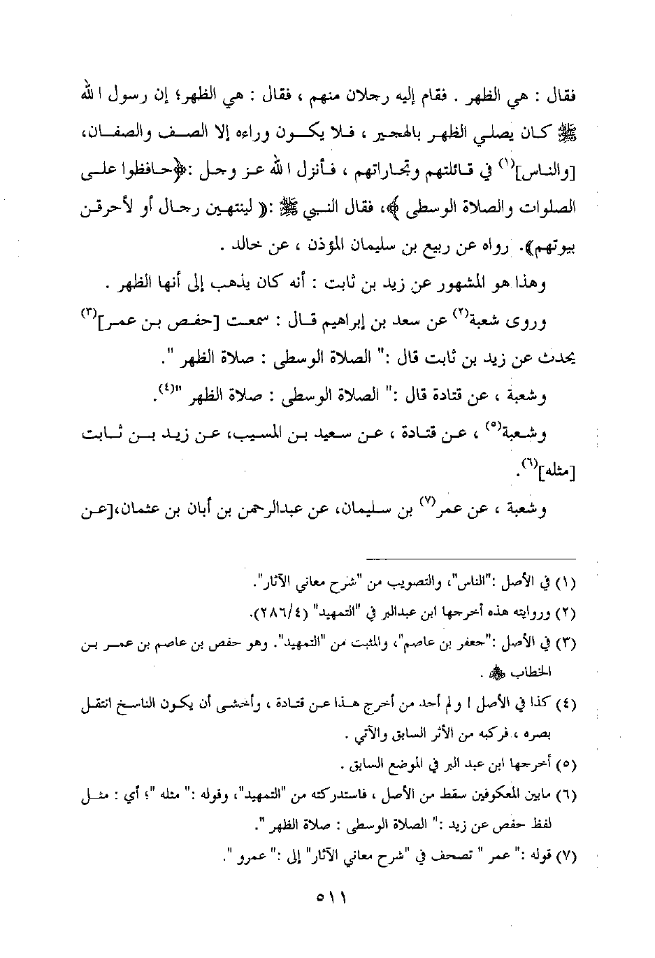 وروى شعبة عن سعد بن إبراهيم قال: سمعت [حفص بن عمر] يحدث عن زيد بن ثابت قال: "الصلاة الوسطى: صلاة الظهر".