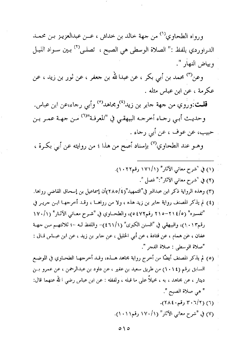 ورواه الطحاوي من جهة خالد بن خداش، عن عبد العزيز بن محمد الدراوردي بلفظ: "الصلاة الوسطى هي الصبح، تصلى بين سواد الليل وبياض النهار".