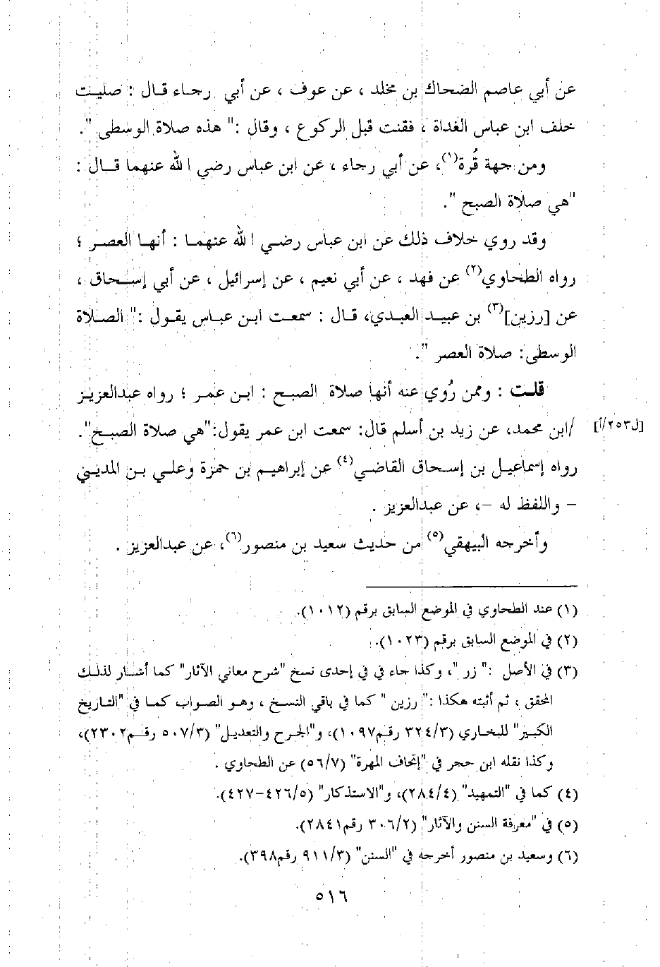 قلت: وممن روي عنه أنها صلاة الصبح: ابن عمر، رواه عبد العزيز بن محمد، عن زيد بن أسلم قال: سمعت ابن عمر يقول: "هي صلاة الصبح".