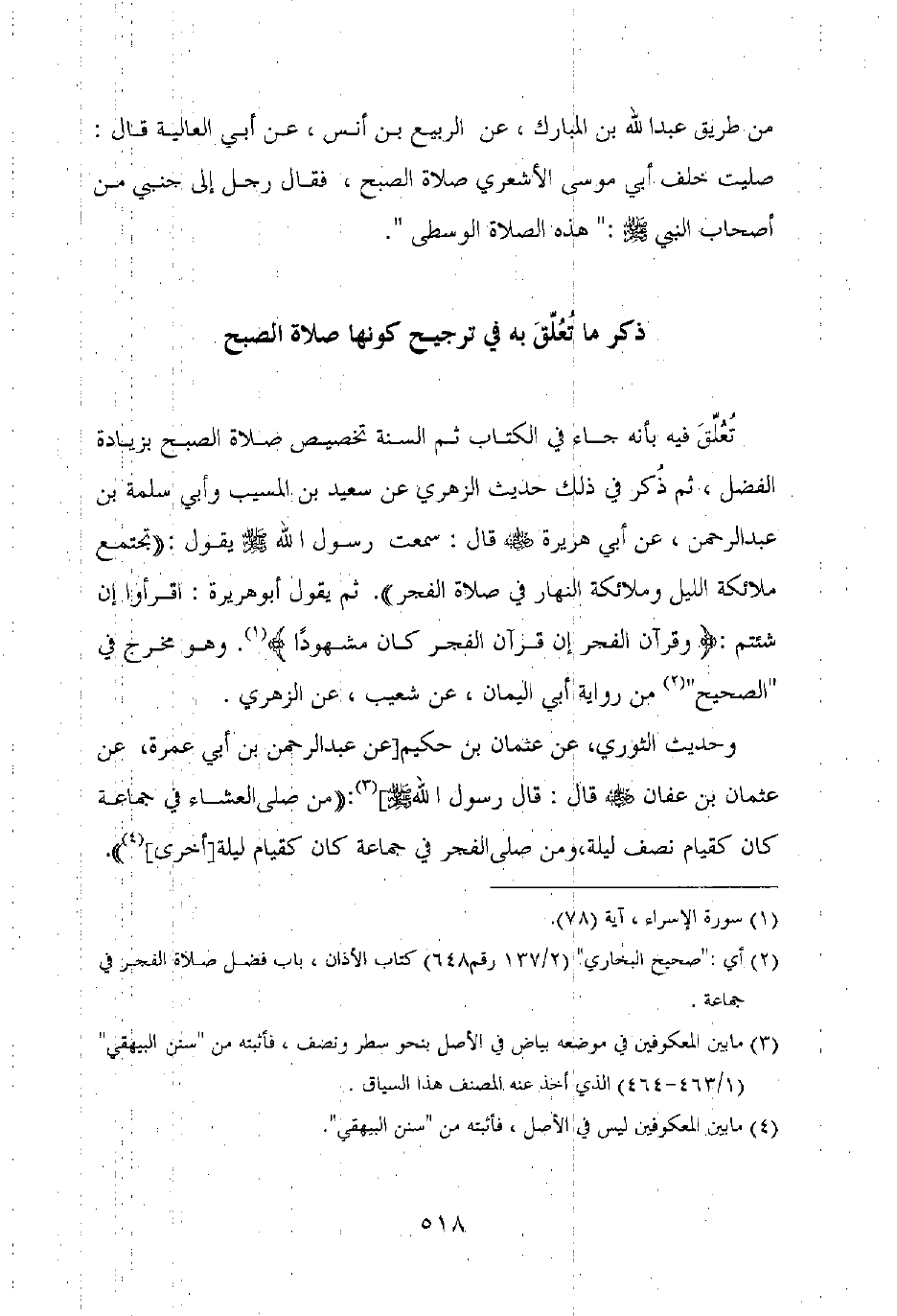 تعلق فيه بأنه جاء في الكتاب ثم السنة تخصيص صلاة الصبح بزيادة الفضل، ثم ذكر في ذلك حديث الزهري عن سعيد بن المسيب وأبي سلمة بن عبد الرحمن، عن أبي هريرة رضي الله عنه قال: سمعت رسول الله صلى الله عليه وسلم يقول: "تجتمع ملائكة الليل وملائكة النهار في صلاة الفجر". ثم يقول أبو هريرة: اقرأوا إن شئتم: {وقرآن الفجر إن قرآن الفجر كان مشهودا}. وهو مخرج في "الصحيح" من رواية أبي اليمان، عن شعيب، عن الزهري.