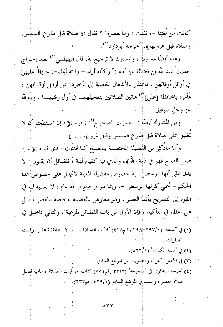 وأما ما ذكر من الفضيلة المختصة بالصبح كالحديث الذي قبله: "من صلى الصبح فهو في ذمة الله"، والذي فيه كقيام ليلة، فلقائل أن يقول: لا يدل على أنها الوسطى، إذ خصوص الفضيلة المعينة لا يدل على خصوص هذا الحكم – أعني كونها الوسطى –، وإنما هو ترجيح بوجه عام، لا نسبه له في القوة إلى التصريح بأنها العصر، وهو معارض بالفضيلة المختصة بالعصر، بل هي أعظم في التأكيد، فإن الأول من باب الفضائل المرغبة، والثاني داخل في