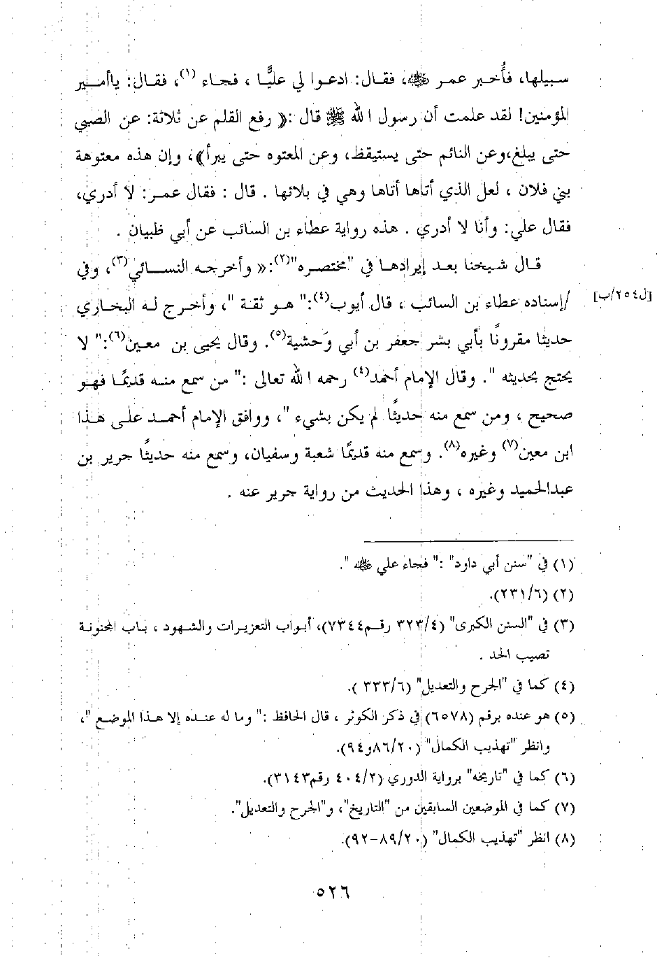 سبيلها، فأخبر عمر رضي الله عنه، فقال: ادعوا لي عليا، فجاء، فقال: يا أمير المؤمنين! لقد علمت أن رسول الله صلى الله عليه وسلم قال: "رفع القلم عن ثلاثة: عن الصبي حتى يبلغ، وعن النائم حتى يستيقظ، وعن المعتوه حتى يبرأ"، وإن هذه معتوهة بني فلان، لعل الذي أتاها وهي في بلائها. قال: فقال عمر: لا أدري، فقال علي: وأنا لا أدري. هذه رواية عطاء بن السائب عن أبي ظبيان.