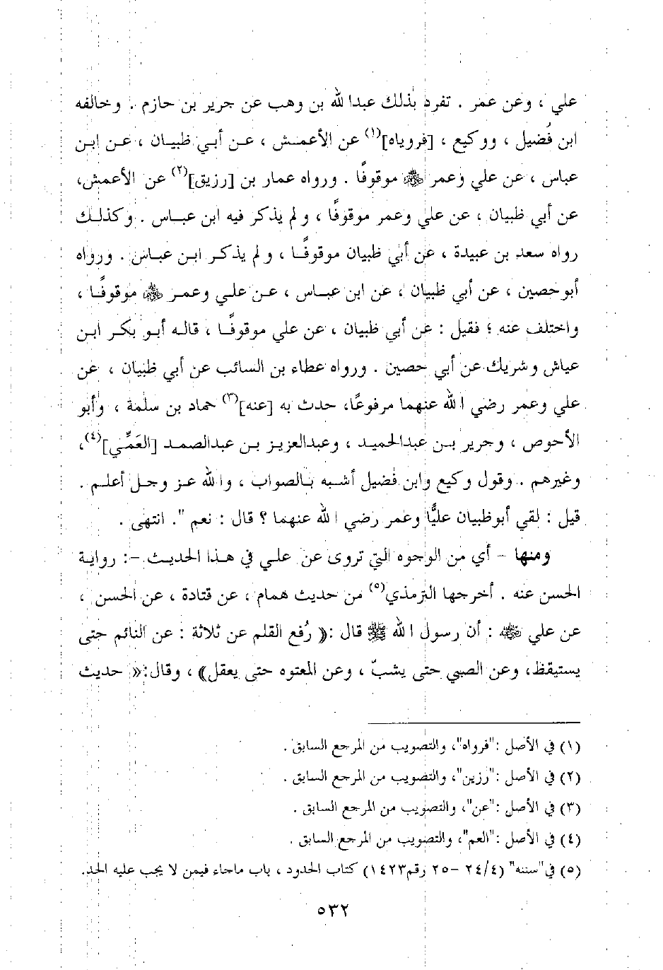 ومنها – أي من الوجوه التي تروى عن علي في هذا الحديث –: رواية الحسن عنه. أخرجها الترمذي من حديث همام، عن قتادة، عن الحسن، عن علي رضي الله عنه: أن رسول الله صلى الله عليه وسلم قال: "رفع القلم عن ثلاثة: عن النائم حتى يستيقظ، وعن الصبي حتى يشب، وعن المعتوه حتى يعقل"، وقال: "حديث