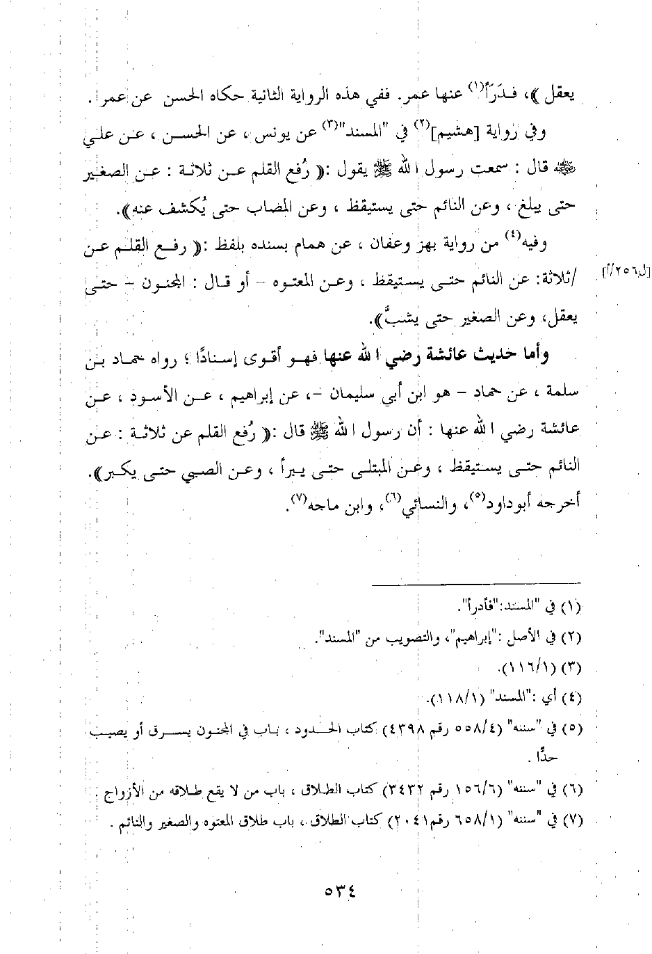 وفيه من رواية بهز وعفان، عن همام بسنده بلفظ: "رفع القلم عن ثلاثة: عن النائم حتى يستيقظ، وعن المعتوه – أو قال: المجنون – حتى يعقل، وعن الصغير حتى يشب".