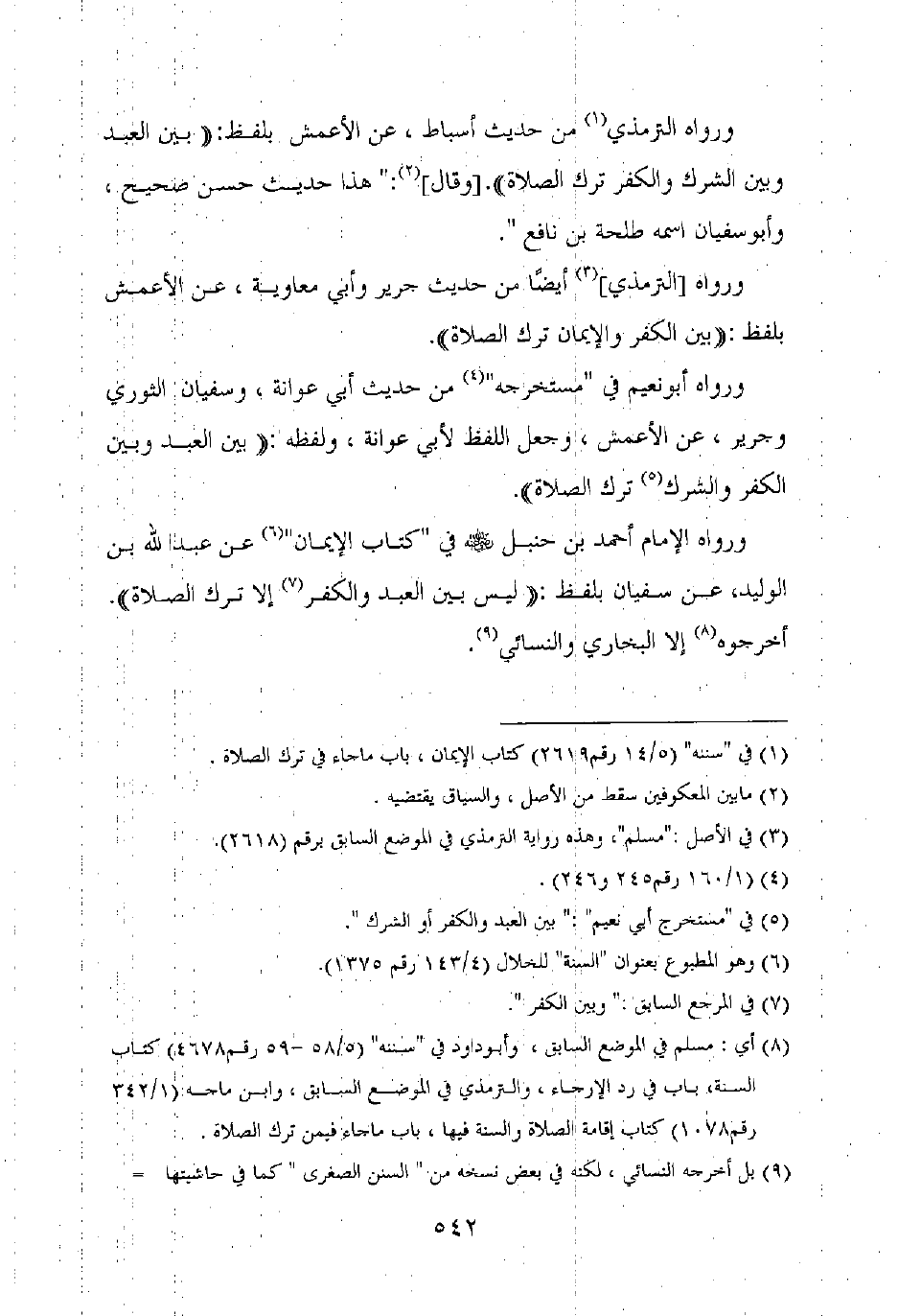 ورواه الإمام أحمد بن حنبل رضي الله عنه في "كتاب الإيمان" عن عبد الله بن الوليد، عن سفيان بلفظ: "ليس بين العبد والكفر إلا ترك الصلاة".