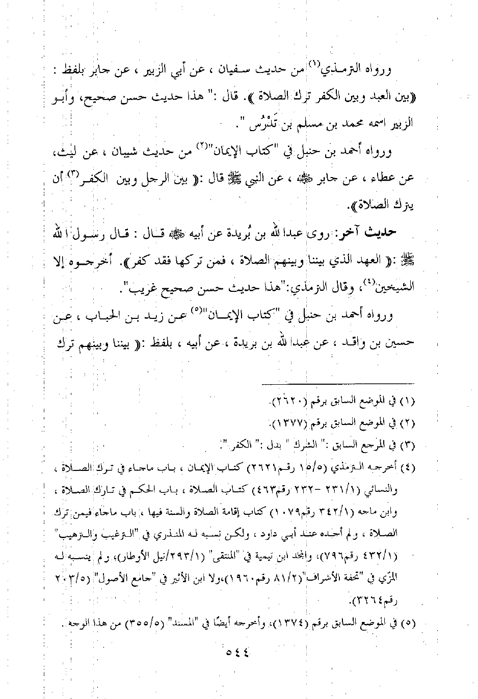 حديث آخر: روى عبد الله بن بريدة عن أبيه رضي الله عنه قال: قال رسول الله صلى الله عليه وسلم: "العهد الذي بيننا وبينهم الصلاة، فمن تركها فقد كفر". أخرجوه إلا الشيخين، وقال الترمذي: "هذا حديث حسن صحيح غريب".