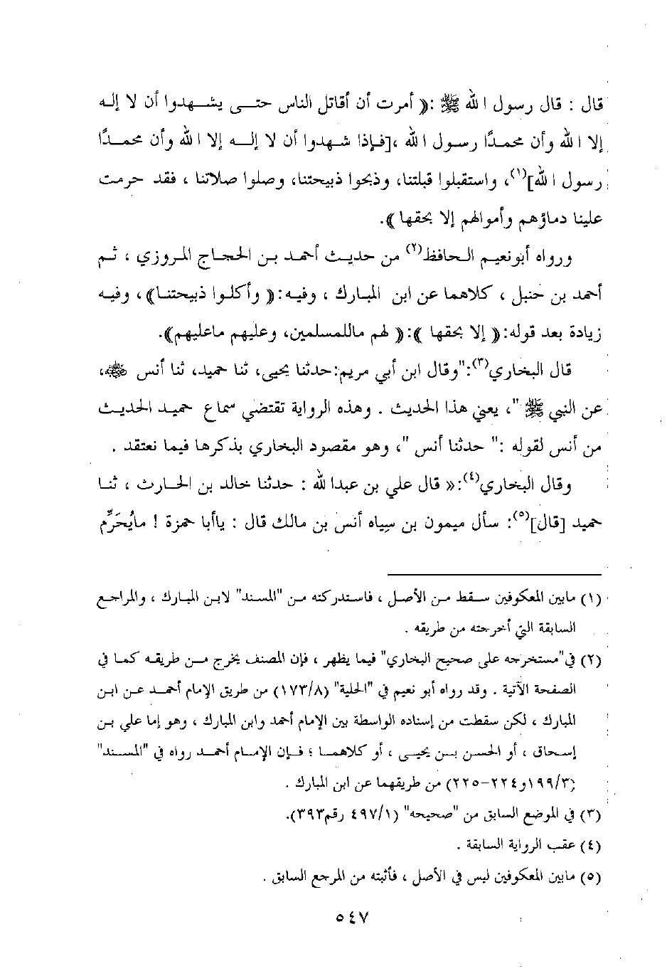 ورواه أبو نعيم الحافظ من حديث أحمد بن الحجاج المروزي، ثم أحمد بن حنبل، كلاهما عن ابن المبارك، وفيه: "وأكلوا ذبيحتنا"، وفيه زيادة بعد قوله: "إلا بحقها": "لهم ما للمسلمين، وعليهم ما عليهم".