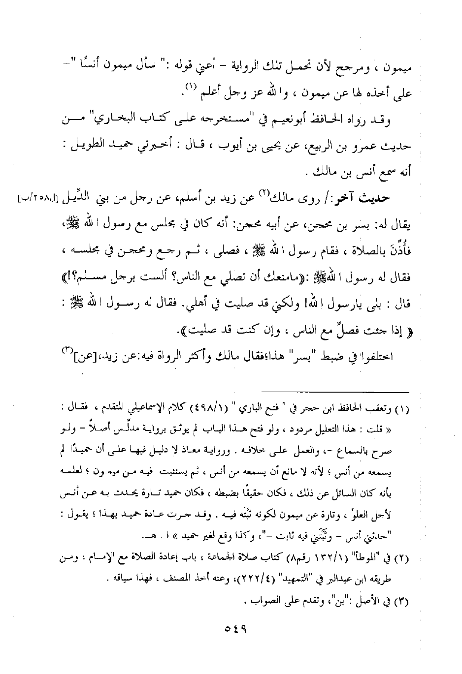 حديث آخر: روى مالك عن زيد بن أسلم، عن رجل من بني الديل يقال له: بسر بن محجن، عن أبيه محجن: أنه كان في مجلس مع رسول الله صلى الله عليه وسلم، فأذن بالصلاة، فقام رسول الله صلى الله عليه وسلم، فصلى، ثم رجع ومحجن في مجلسه، فقال له رسول الله صلى الله عليه وسلم: "ما منعك أن تصلي مع الناس؟ ألست برجل مسلم؟! " قال: بلى يا رسول الله! ولكني قد صليت في أهلي. فقال له رسول الله صلى الله عليه وسلم: "إذا جئت فصل مع الناس، وإن كنت قد صليت".