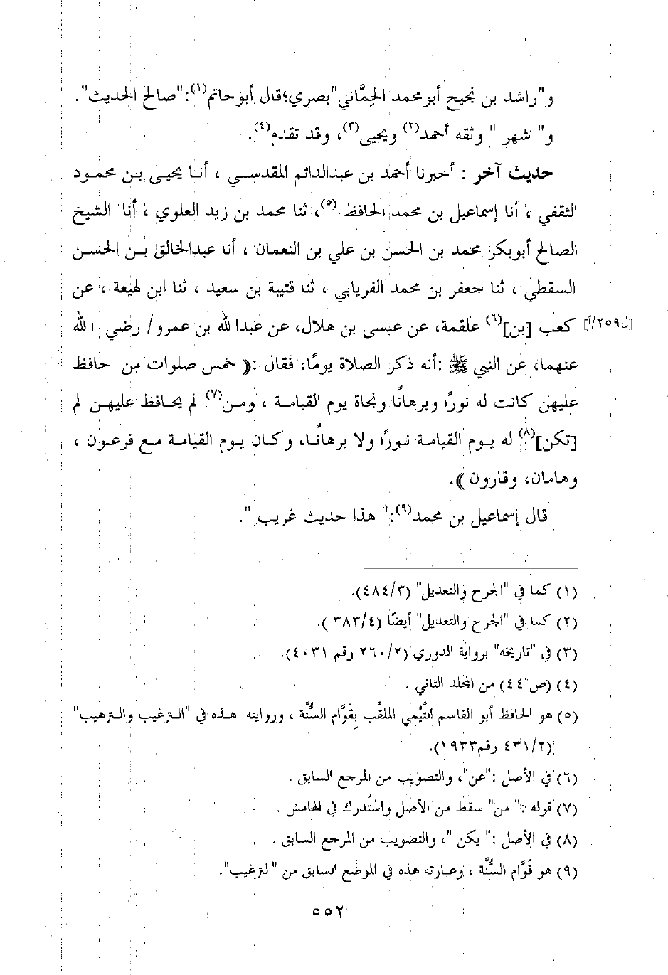 حديث آخر: أخبرنا أحمد بن عبد الدائم المقدسي، أنا يحيى بن محمود الثقفي، أنا إسماعيل بن محمد الحافظ، ثنا محمد بن زيد العلوي، أنا الشيخ الصالح أبو بكر محمد بن الحسن بن علي بن النعمان، أنا عبد الخالق بن الحسن السقطي، ثنا جعفر بن محمد الفريابي، ثنا قتيبة بن سعيد، ثنا ابن لهيعة، عن كعب [بن] علقمة، عن عيسى بن هلال، عن عبد الله بن عمرو رضي الله عنهما، عن النبي صلى الله عليه وسلم: أنه ذكر الصلاة يوما، فقال: "خمس صلوات من حافظ عليهن كانت له نورا وبرهانا ونجاة يوم القيامة، ومن لم يحافظ عليهن لم [تكن] له يوم القيامة نورا ولا برهانا، وكان يوم القيامة مع فرعون، وهامان، وقارون".