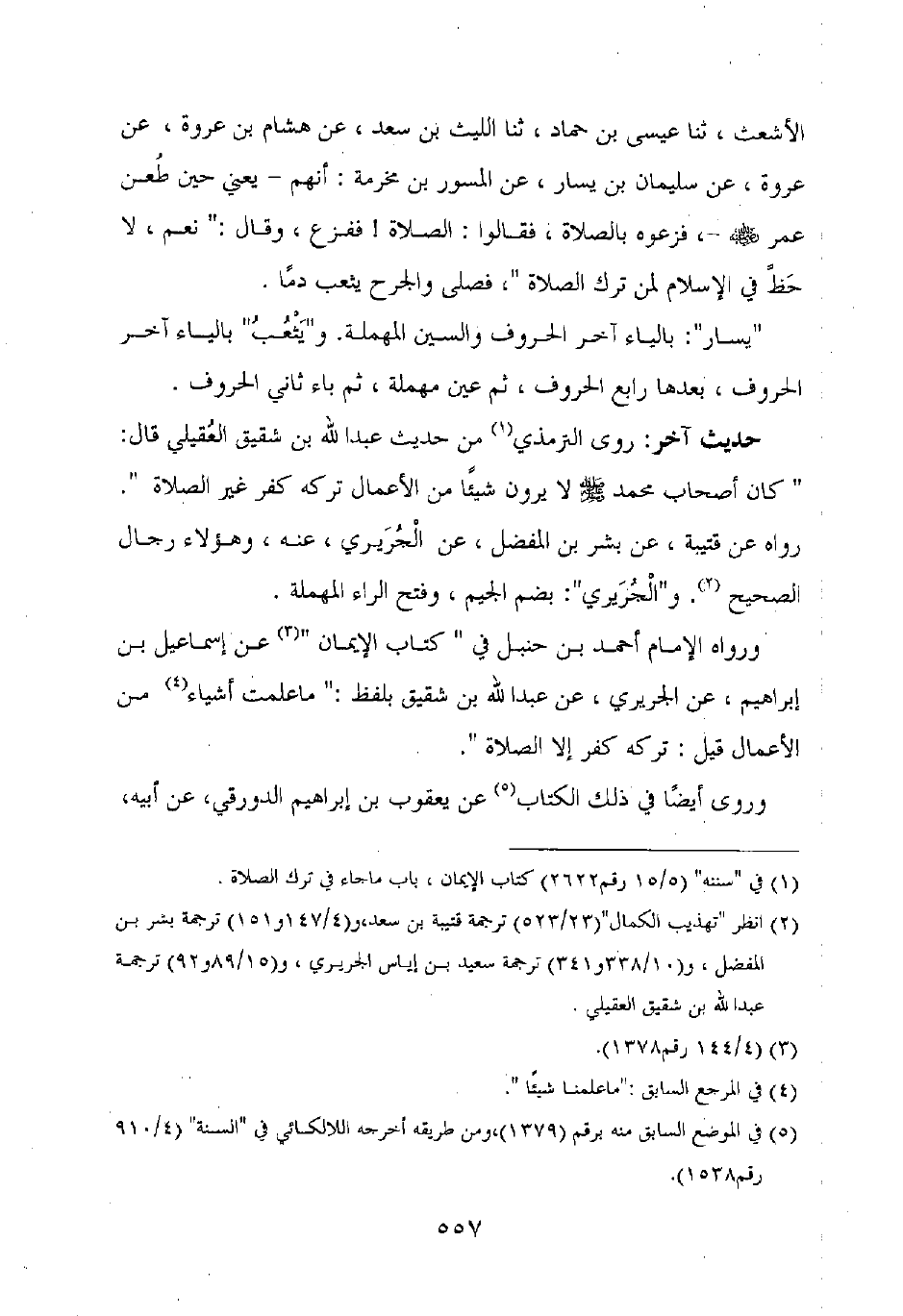 ورواه الإمام أحمد بن حنبل في "كتاب الإيمان" عن إسماعيل بن إبراهيم، عن الجريري، عن عبد الله بن شقيق بلفظ: "ما علمت أشياء من الأعمال قيل: تركه كفر إلا الصلاة".