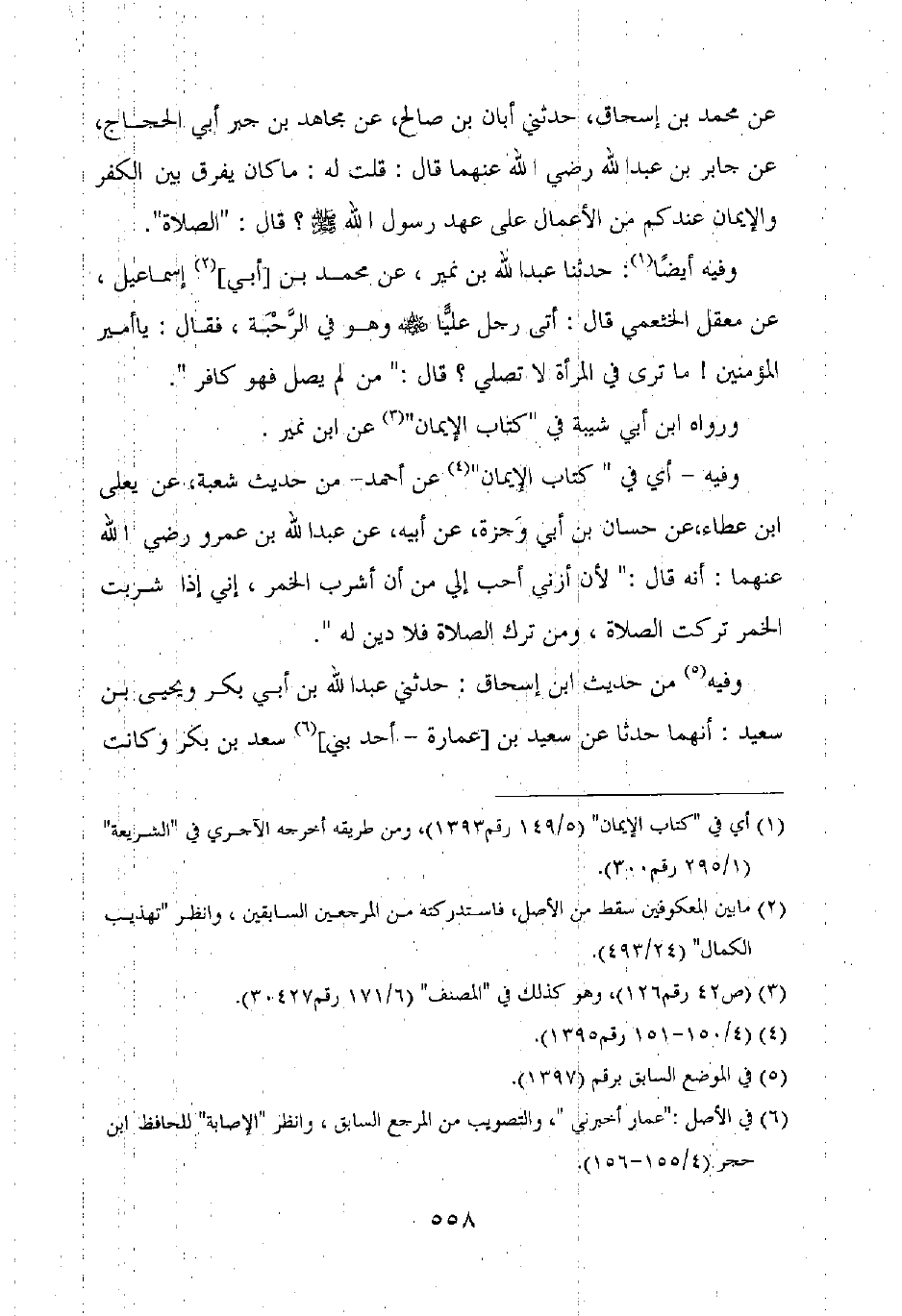 عن محمد بن إسحاق، حدثني أبان بن صالح، عن مجاهد بن جبر أبي الحجاج، عن جابر بن عبد الله رضي الله عنهما قال: قلت له: ما كان يفرق بين الكفر والإيمان عندكم من الأعمال على عهد رسول الله صلى الله عليه وسلم؟ قال: "الصلاة".