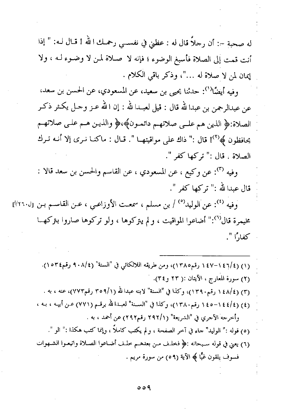 وفيه أيضا: حدثنا يحيى بن سعيد، عن المسعودي، عن الحسن بن سعد، عن عبد الرحمن بن عبد الله قال: قيل لعبد الله: إن الله عز وجل يكثر ذكر الصلاة: {الذين هم على صلاتهم دائمون}، {والذين هم على صلاتهم يحافظون}! قال: "ذاك على مواقيتها". قال: ما كنا نرى إلا أنه تررك الصلاة. قال: "تركها كفر".