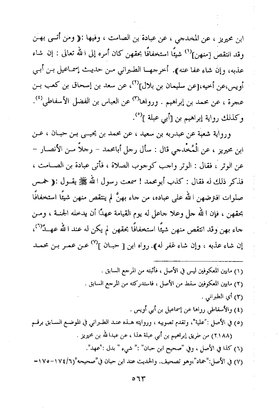 ورواية شعبة عن عبد ربه بن سعيد، عن محمد بن يحيى بن حبان، عن ابن محيريز، عن المخدجي قال: سأل رجل أبا محمد – رجلا من الأنصار – عن الوتر، فقال: الوتر واجب كوجوب الصلاة، فأتى عبادة بن الصامت، فذكر ذلك له فقال: كذب أبو محمد! سمعت رسول الله صلى الله عليه وسلم يقول: "خمس صلوات افترضهن الله على عباده، من جاء بهن لم ينتقص منهن شيئا استخفافا بحقهن، فإن الله جل وعلا جاعل له يوم القيامة عهدا أن يدخله الجنة، ومن جاء بهن وقد انتقص منهن استخفافا بحقهن لم يكن له عند الله عهد، إن شاء عذبه، وإن شاء غفر له". رواه ابن [حبان] عن عمر بن محمد