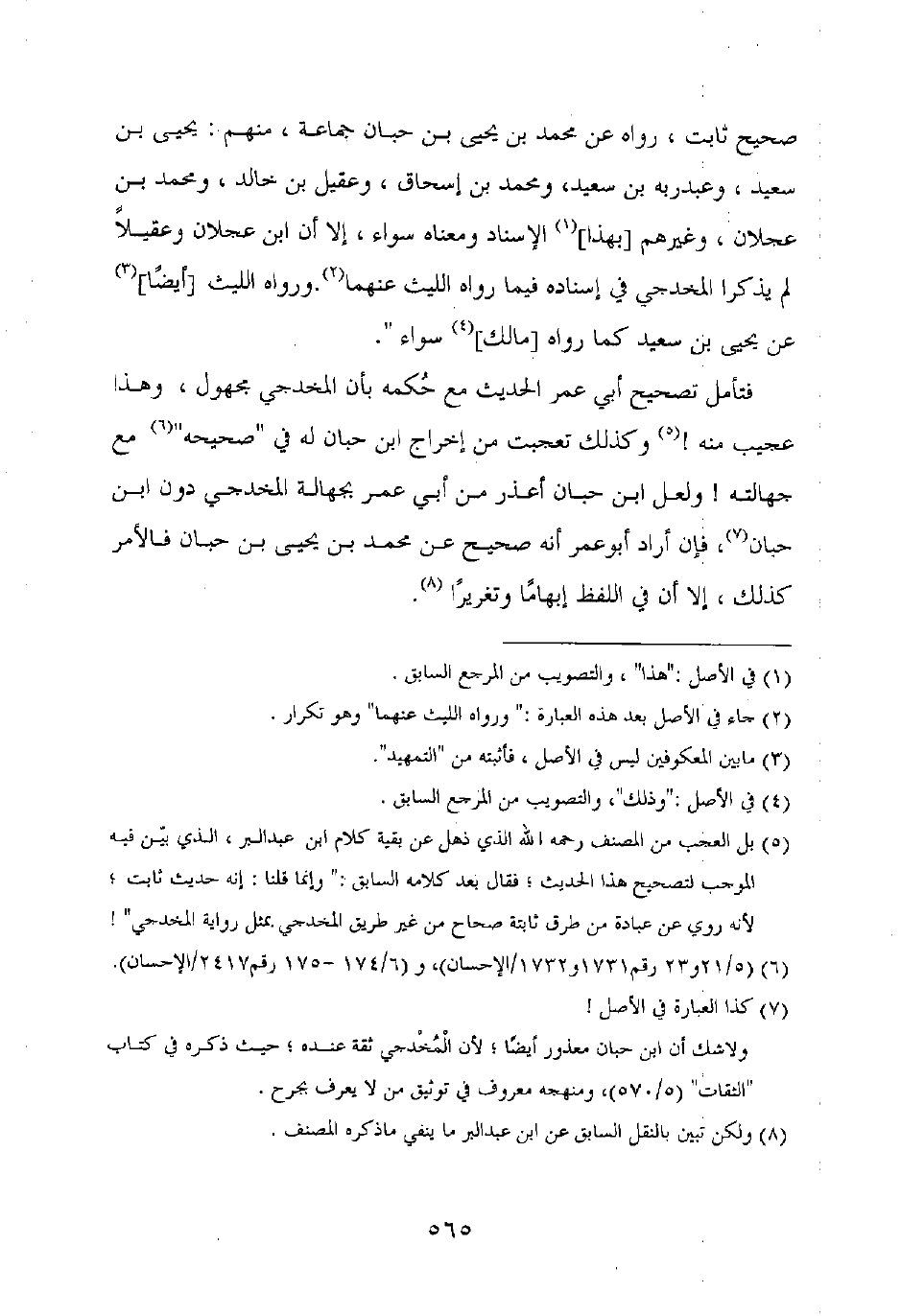 فتأمل تصحيح أبي عمر الحديث مع حكمه بأن المخدجي مجهول، وهذا عجيب منه! وكذلك تعجبت من إخراج ابن حبان له في"صحيحه" مع جهالته! ولعل ابن حبان أعذر من أبي عمر بجهالة المخدجي دون ابن حبان، فإن أراد أبو عمر أنه صحيح عن محمد بن يحيى بن حبان فالأمر كذلك، إلا أن في اللفظ إبهاما وتغريرا.