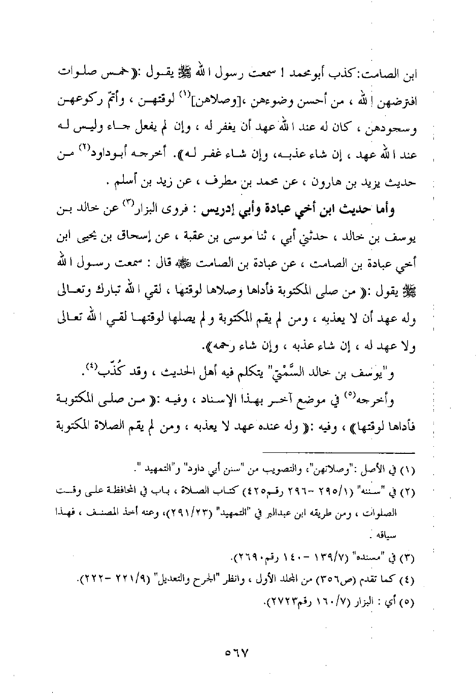 ابن الصامت: كذب أبو محمد! سمعت رسول الله صلى الله عليه وسلم يقول: "خمس صلوات افترضهن الله، من أحسن وضوءهن، [وصلاهن] لوقتهن، وأتم ركوعهن وسجودهن، كان له عند الله عهد أن يغفر له، وإن لم يفعل جاء وليس له عند الله عهد، إن شاء عذبه، وإن شاء غفر له". أخرجه أبو داود من حديث يزيد بن هارون، عن محمد بن مطرف، عن زيد بن أسلم.