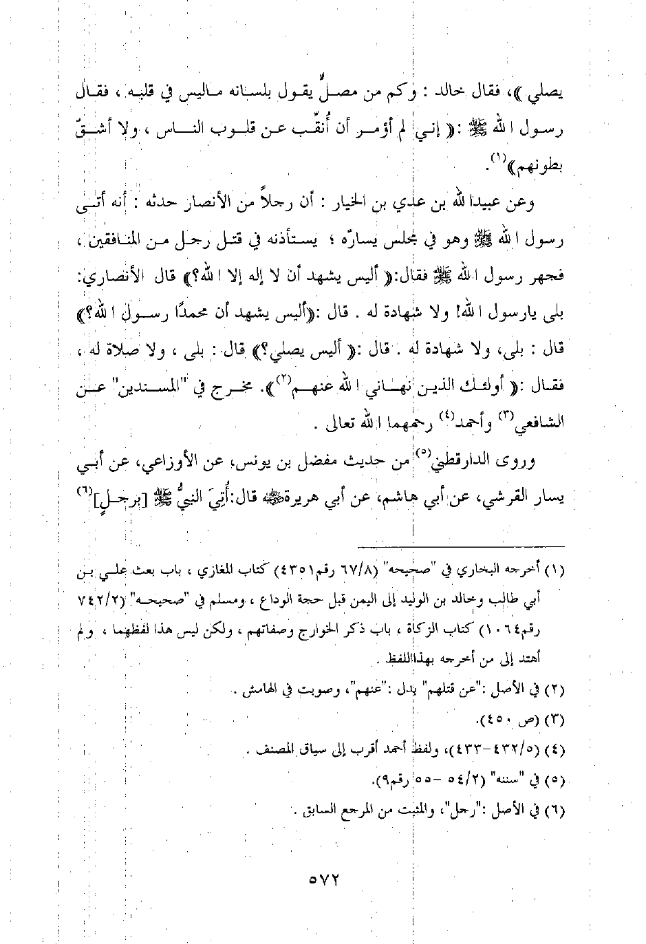 يصلي"، فقال خالد: وكم من مصل يقول بلسانه ما ليس في قلبه، فقال رسول الله صلى الله عليه وسلم: "إني لم أؤمر أن أنقب عن قلوب الناس، ولا أشق بطونهم".
